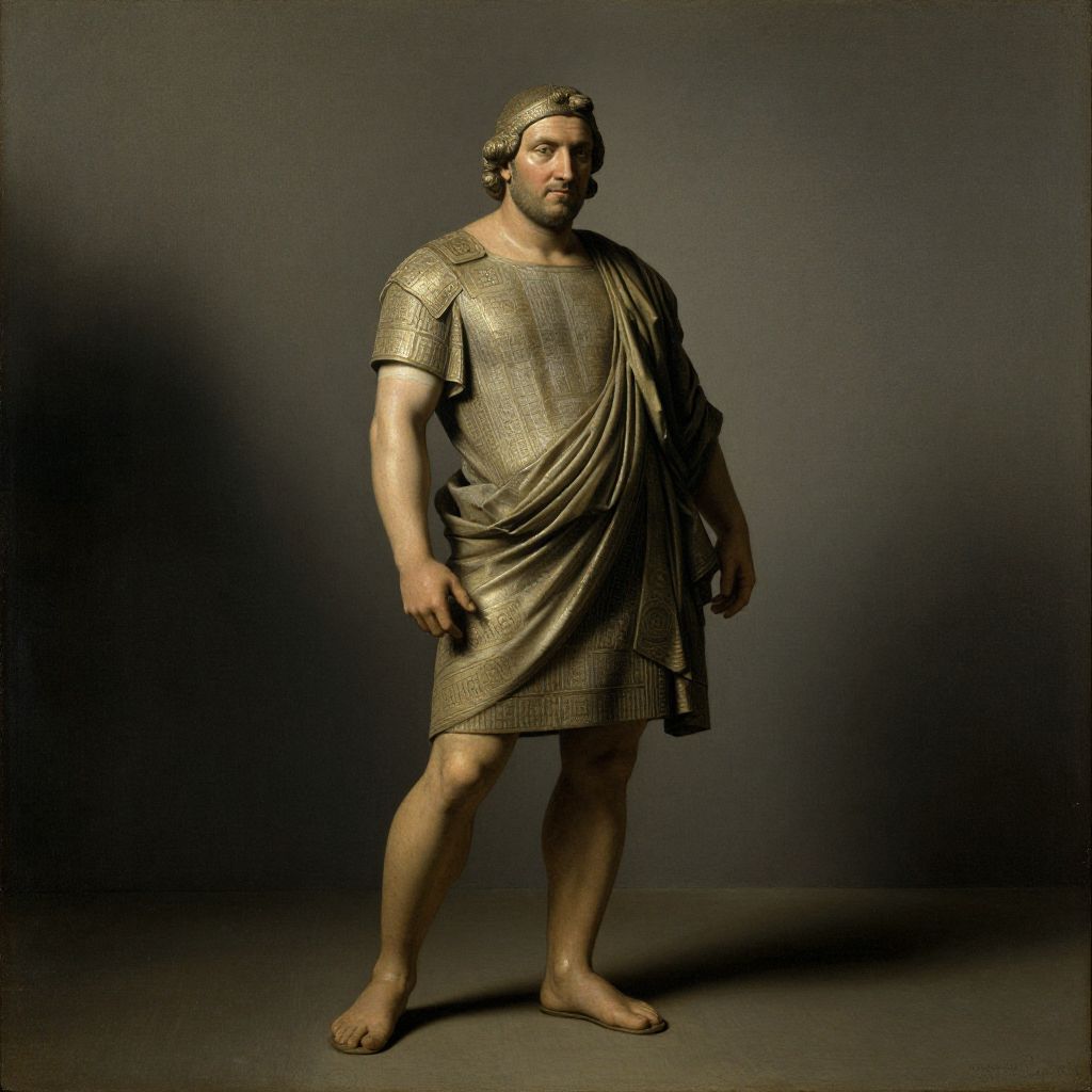 Photograph of a Caucasian man with a muscular build, light skin, and short brown hair, wearing a bronze-colored, ancient Greek-style tunic with a grid pattern and a matching crown. The tunic drapes over his shoulders and reaches mid-thigh, revealing his bare legs and feet. He stands against a dark, gradient background with a shadow on the left, giving a dramatic effect. His expression is neutral, and he stands with his weight on his right leg, left leg slightly bent, and arms relaxed at his sides. The image has a classical, historical feel.