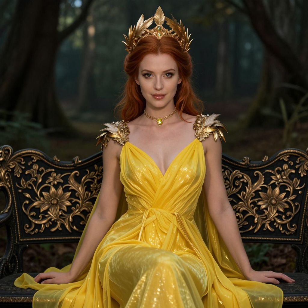 Photograph of a fair-skinned, red-haired woman with blue eyes, sitting in a grassy field at sunset. She wears a gold-sequined, sleeveless gown with a deep V-neck and intricate patterns. Her wavy hair cascades over her shoulders. The sky behind her is a gradient of purple, pink, and orange, with scattered clouds. The grass is green with white wildflowers. The woman's expression is calm, and her gown catches the light, creating a shimmering effect. The image has a dreamy, ethereal quality.