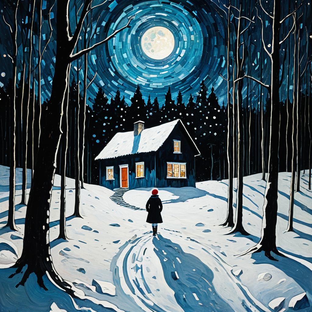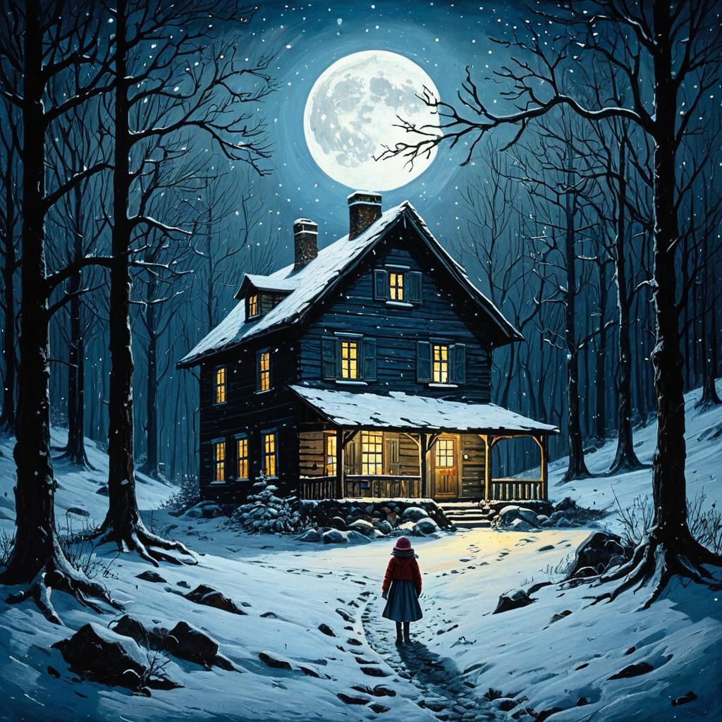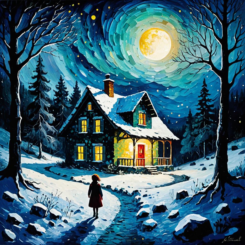 An incredibly winter mystical landscape featuring a lonely mysterious house in a night forest on a moonlit night and a little girl in front of it, in a style that combines Hilma af Klint, Egon Schiele, Joaquín Sorolla but with an original twist. Interesting well-chosen and well-combined colors, high clarity and contrast of picture fragments, oil painting, heavy brush strokes, imitation of handwork, masterpiece, broken glass effect, mythical, iridescent scales, breathtaking beauty, volumetric light, auras, vivid color reflections