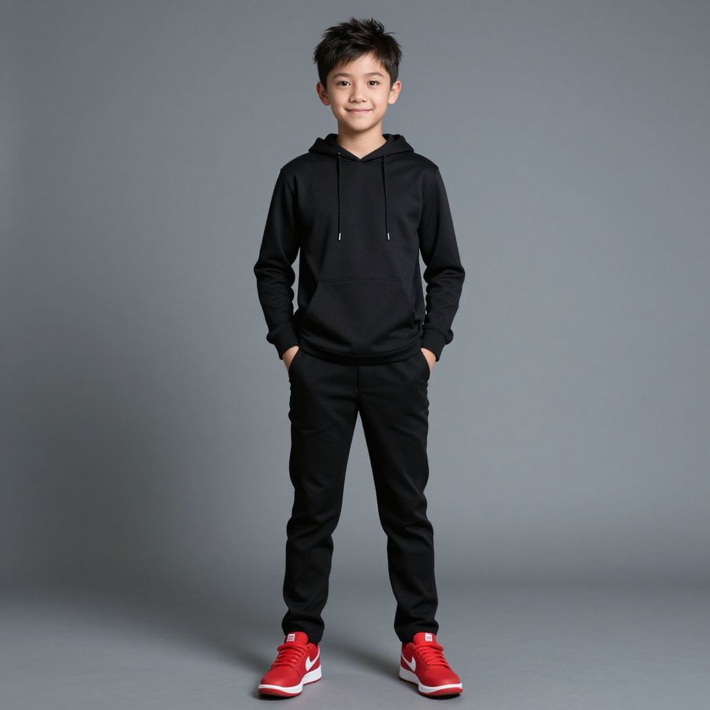 Photograph of a young Asian boy with short black hair, wearing a black hoodie, black pants, and red sneakers, standing against a gray studio background