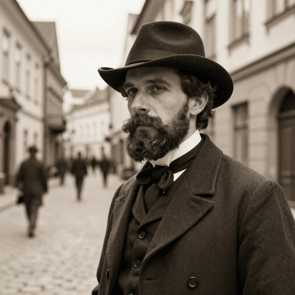 Backenbärte styled in a classic 19th-century fashion, detailed texture of facial hair, sepia tone, man wearing a hat and a traditional suit, old European street, historical and nostalgic atmosphere