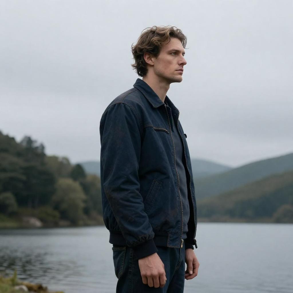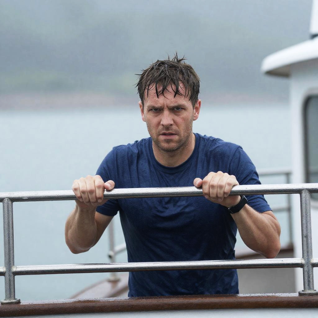 A man with wet brown hair, wearing a soaked black jacket and gray shirt, clutches a metal pole while partially submerged in a dirty puddle. He has a worried expression. Metal railing on the right. Foggy background.