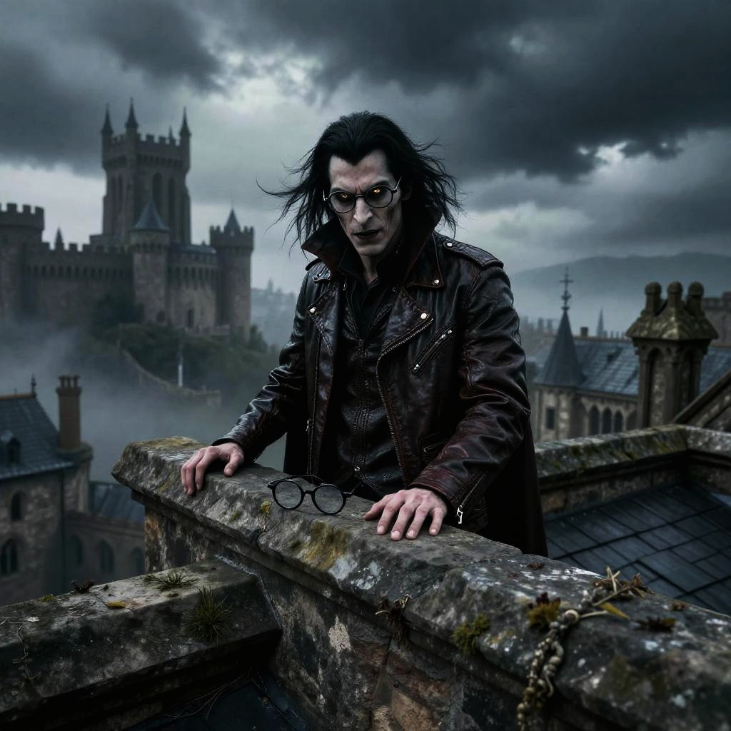 A fierce vampire with glasses perched on the edge of an ancient stone rooftop overlooking a foggy medieval city, piercing eyes glowing softly, long flowing hair and a leather jacket, dark clouds swirling above, dramatic and atmospheric scene, high contrast lighting.