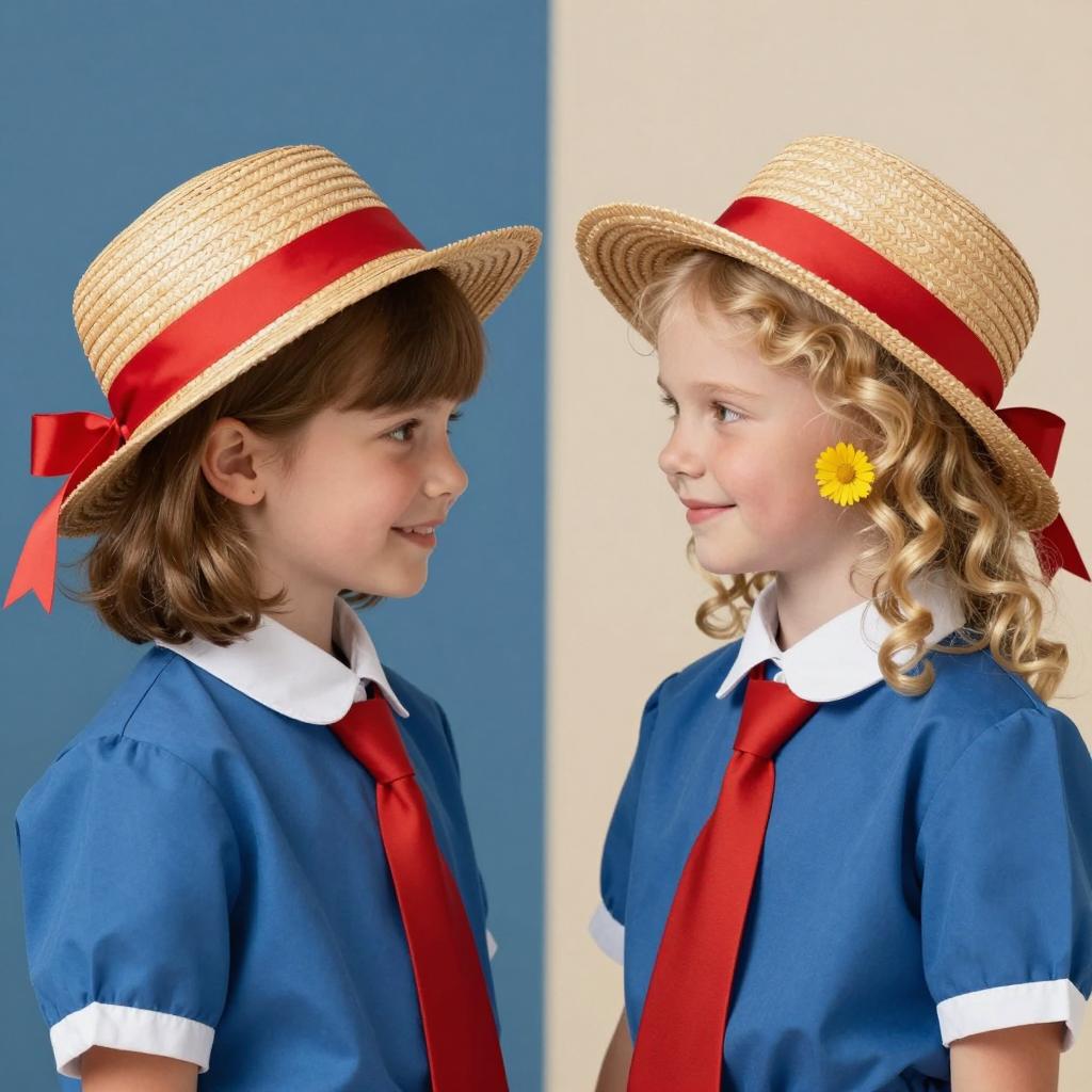 Photograph of two young girls with straw hats and red ribbons, blue uniforms, white collars, and red ties. One girl has short brown hair, the other has blonde curls. Both looking at each other, girl on right with yellow flower. Background is blue and beige.