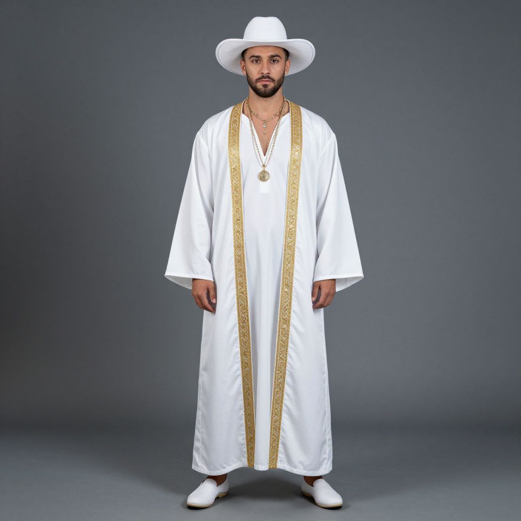 White man costume, 1boy, male focus, solo, beard, facial hair, hat, standing, full body, looking at viewer, robe, necklace, jewelry