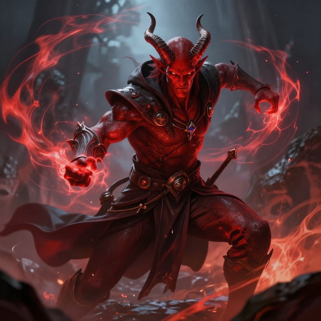Digital illustration of a muscular, demonic figure with glowing red skin, large black horns, and intense red eyes. He is clad in dark, tattered robes with metallic shoulder plates and a belt adorned with circular ornaments. The demon is crouched, his right arm extended forward with a red, fiery energy ball emanating from his clenched fist. His left arm is raised, surrounded by swirling red flames. The background is a dark, cavernous setting with faint blue light filtering through, casting shadows and adding depth. The overall atmosphere is menacing and mystical.