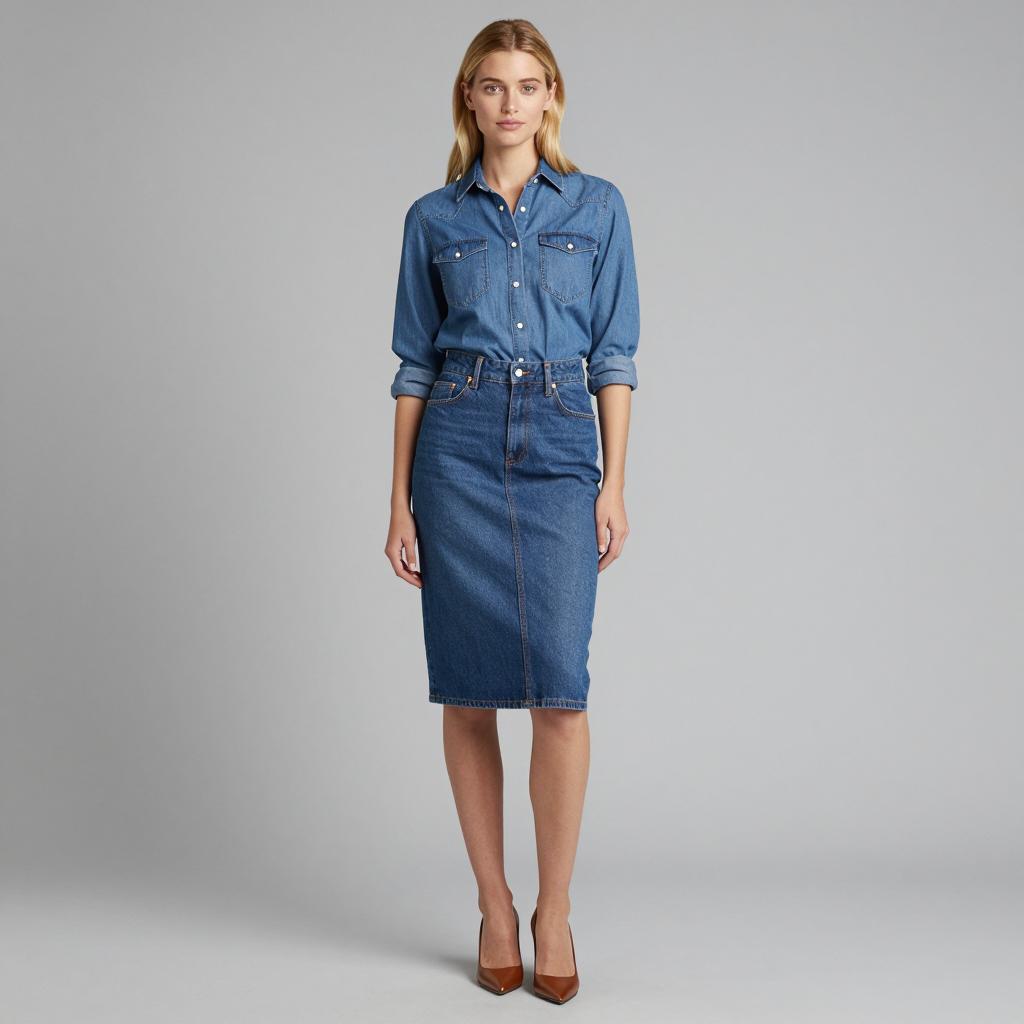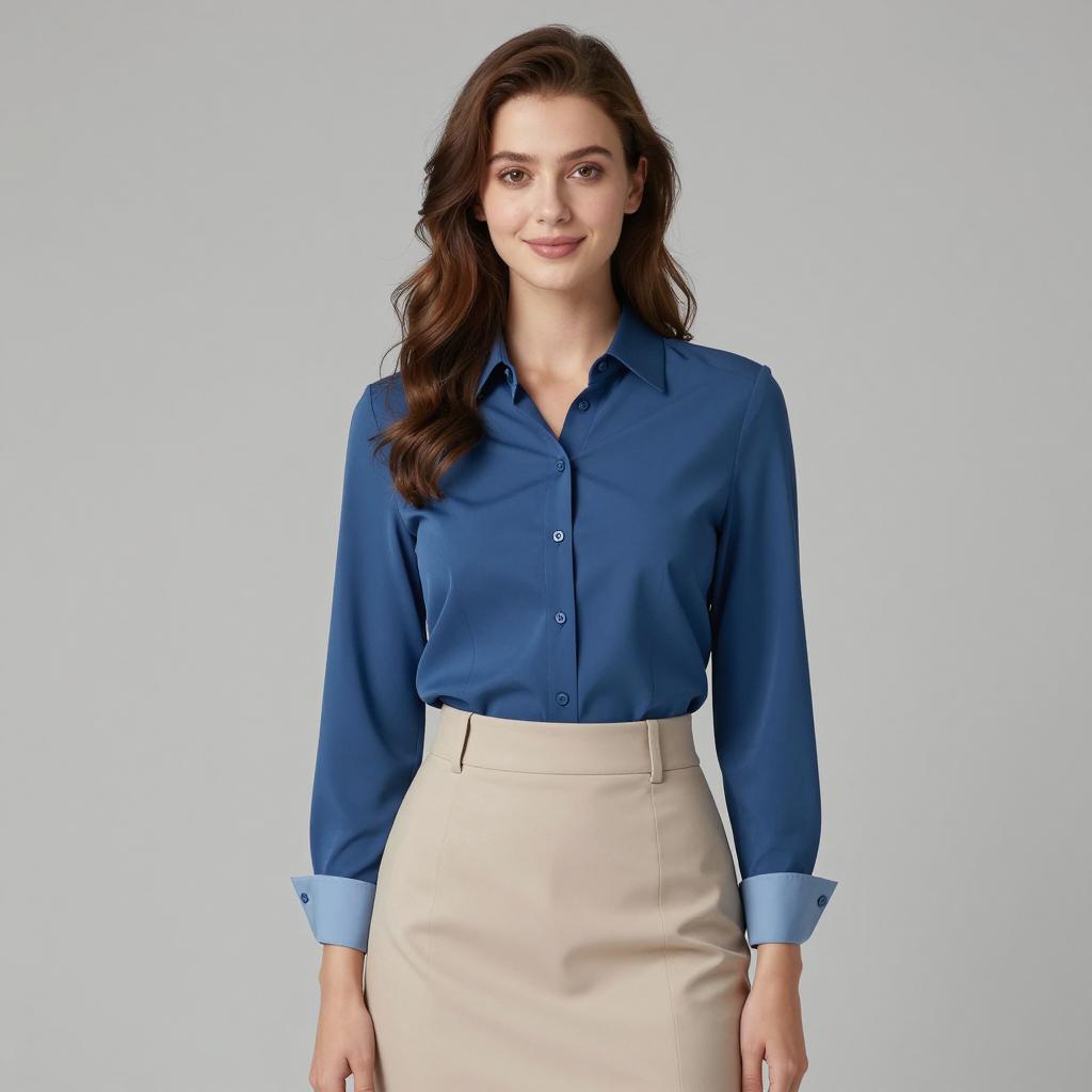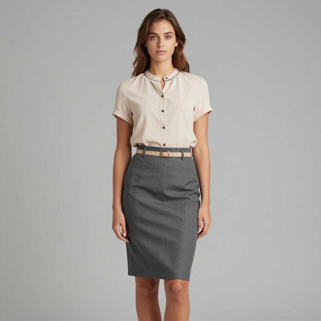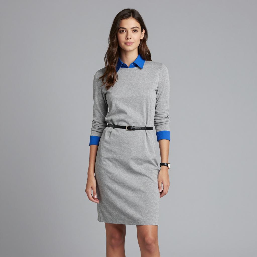 Casual office attire woman, photograph of a young woman, standing, grey long-sleeve dress with blue collar and cuffs, black belt, black wristwatch, long wavy brown hair, light skin, neutral expression, grey background, studio lighting, realistic, professional, casual business attire, full body shot, centered, minimalistic, modern fashion, no background objects, simple and clean style