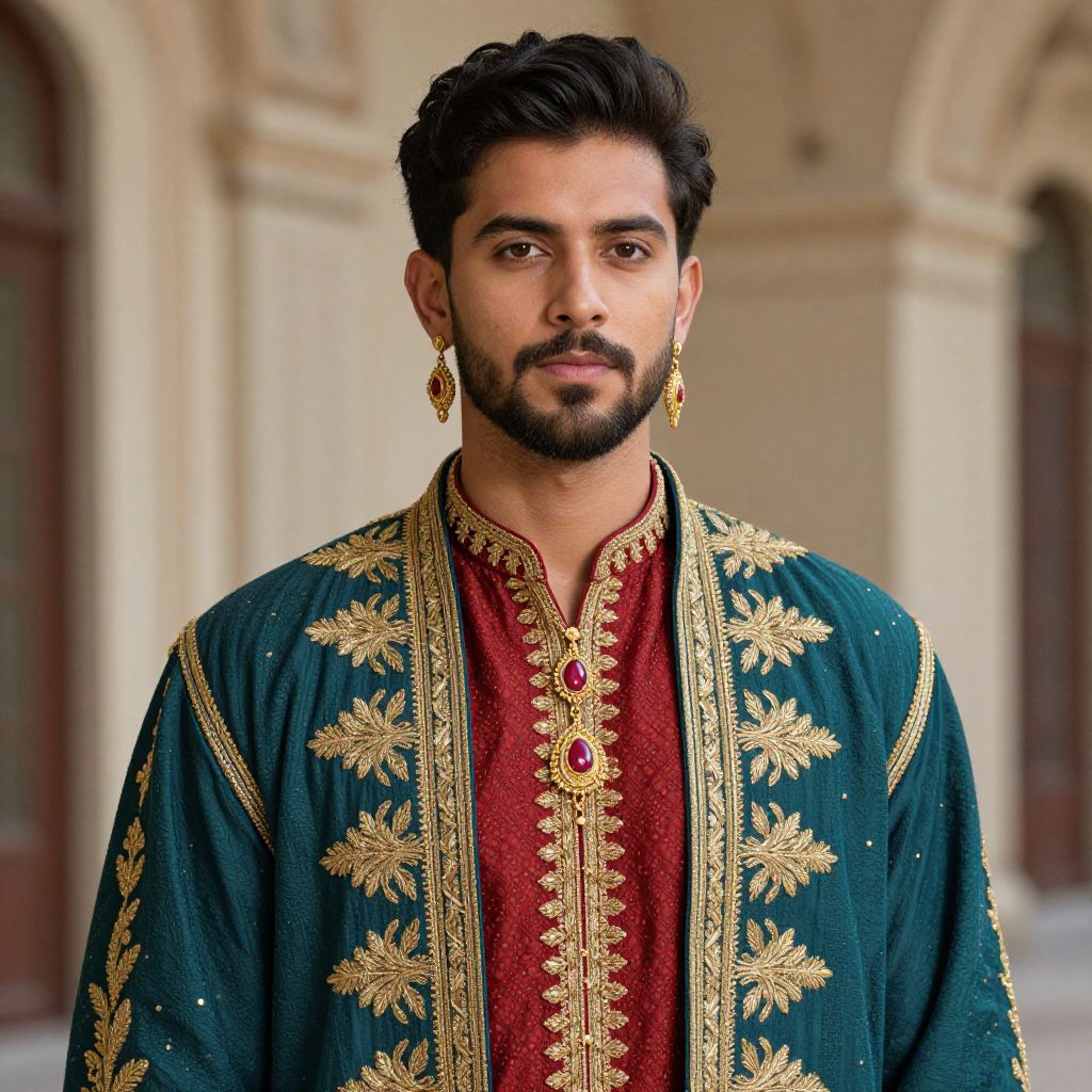 A young man with black hair and a trimmed beard wears an ornate royal-inspired costume featuring rich teal and red fabrics with gold embroidery. The detailed garment is complemented by matching jewelry, including earrings and a pendant, set against a classical architectural backdrop.