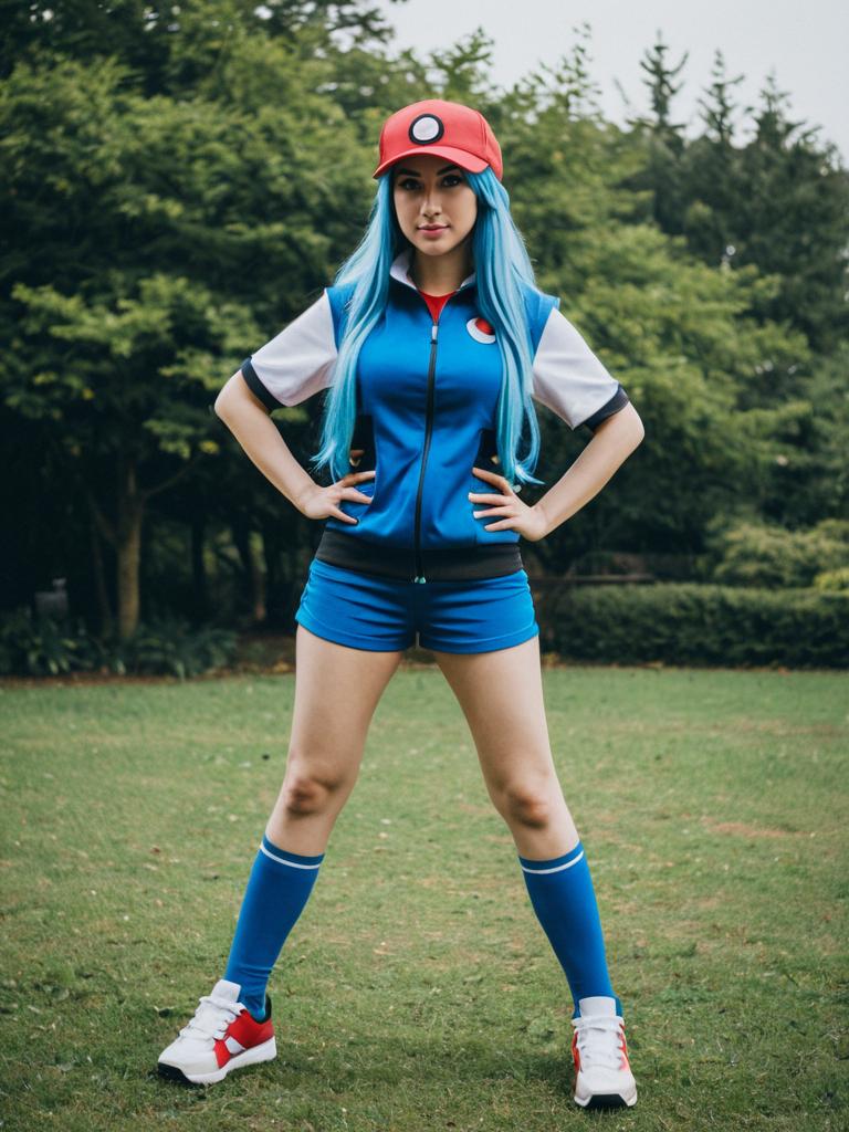 Full body photo of a young woman cosplaying as an Ace Trainer from Pokemon, wearing a blue, white, and red costume with a matching cap and blue long hair. She stands confidently on a forest path surrounded by green trees and foliage.