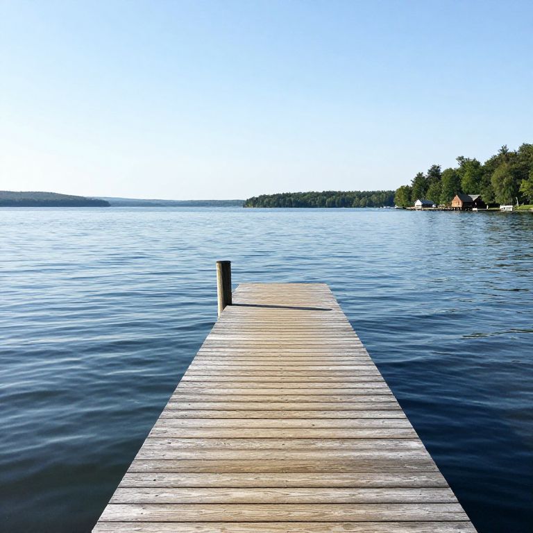 Serenity stretches across Canandaigua Lake, where the wooden dock invites contemplation, its gentle creaks and the soft ripple of water beneath hinting at the timeless dance between solitude and connection.