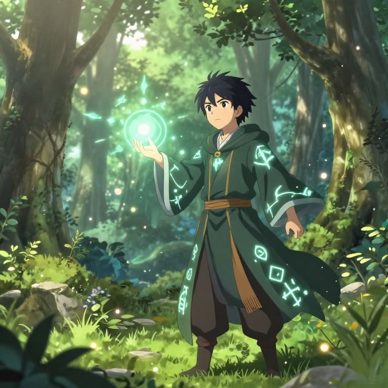 Anime-style digital artwork of a young man with black hair and green glowing robe, casting a bright magical circle in a sunlit, enchanted forest.