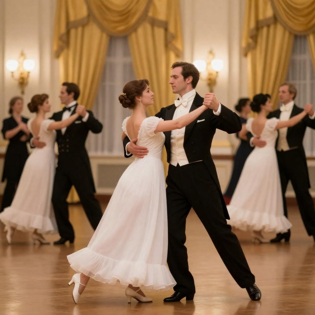 Photograph of a lively dance party in a wooden-floored room. Dancers, mostly in 1970s-style clothing, including white pants, dresses, and sleeveless tops, dance energetically. A woman in a white dress and a man in white pants are in the center, surrounded by others. Background includes seated observers and dim lighting.