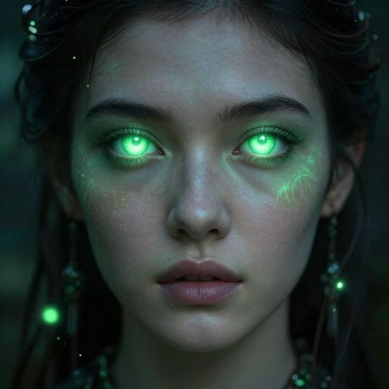 Photorealistic digital portrait of a young woman with glowing green eyes, set against a dark, blurred background. Her skin is fair with subtle freckles, and she has dark brown, wavy hair adorned with small, glowing green beads. Her expression is neutral, with slightly parted full lips. Her eyes, emitting an eerie, luminescent green light, have intricate, glowing green patterns on her right cheek. The overall lighting is cool, emphasizing the green glow in her eyes and beads, creating a supernatural or mystical effect. The image is highly detailed, focusing on her face.