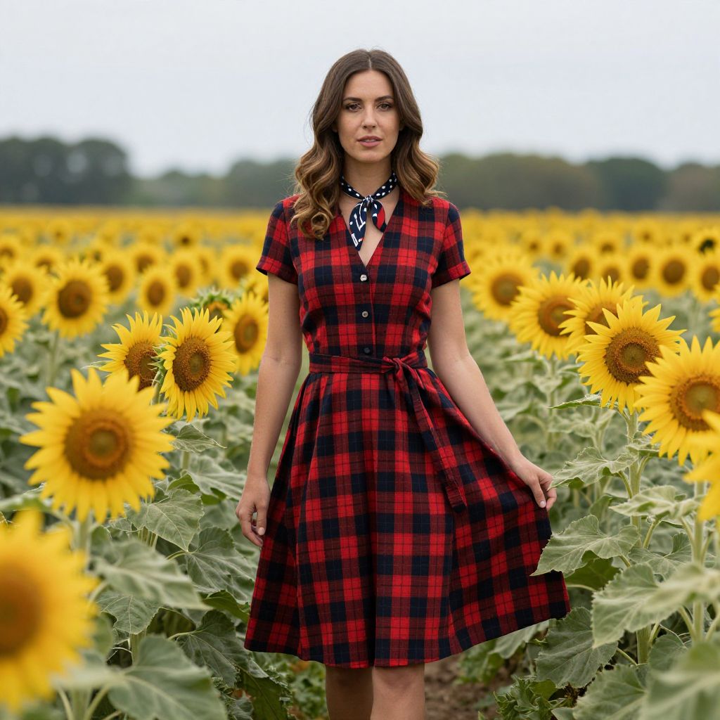 Photograph of a young woman with light olive skin and wavy brown hair standing in a vast sunflower field. She wears a short-sleeved, red and black plaid dress with a belted waist and a black-and-white patterned necktie. The sunflowers, with bright yellow petals and green leaves, surround her, creating a vibrant, natural backdrop. The sky above is overcast, and the horizon shows a line of trees. She stands confidently, gazing directly at the camera, with a slight smile on her face. The image is sharp with a shallow depth of field, focusing on the woman while softly blurring the background.