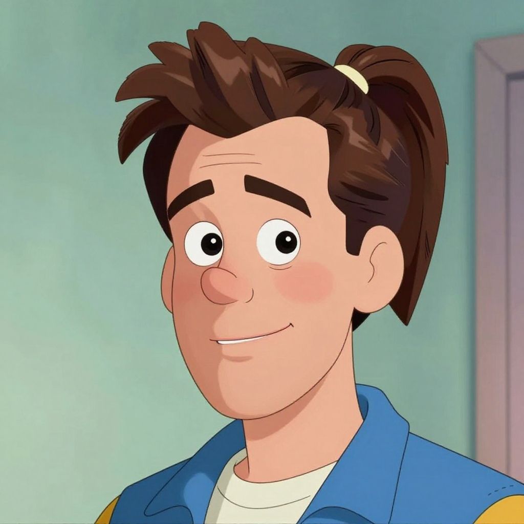 Jim Carrey ponytail in a retro 90s cartoon style, exaggerated facial features, bright colors, playful mood, high detail, 4k digital art, character concept
