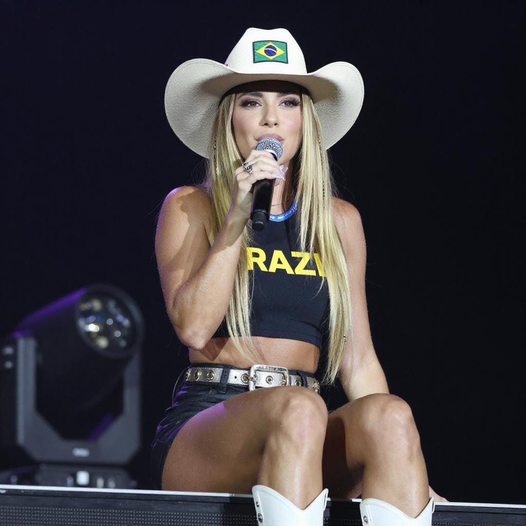 Photograph of a blonde woman with long hair, wearing a white cowboy hat with a Brazilian flag emblem, black crop top with "BRAZIL" in yellow letters, black shorts, and white socks. She sits on a stage, holding a microphone to her mouth, with a dark background and stage equipment visible behind her.