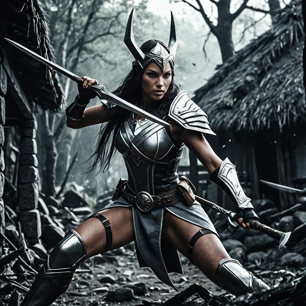 A muscular cartoon warrior wearing a blue sleeveless top and fur-trimmed boots wields a large stone mace and a wooden spear. The warrior is in an aggressive fighting stance in a vibrant village setting with small thatched huts and lush greenery. In the background, smaller cartoon characters with weapons appear ready to assist. The scene is colorful, adventurous, and depicts a fantasy village battle.
