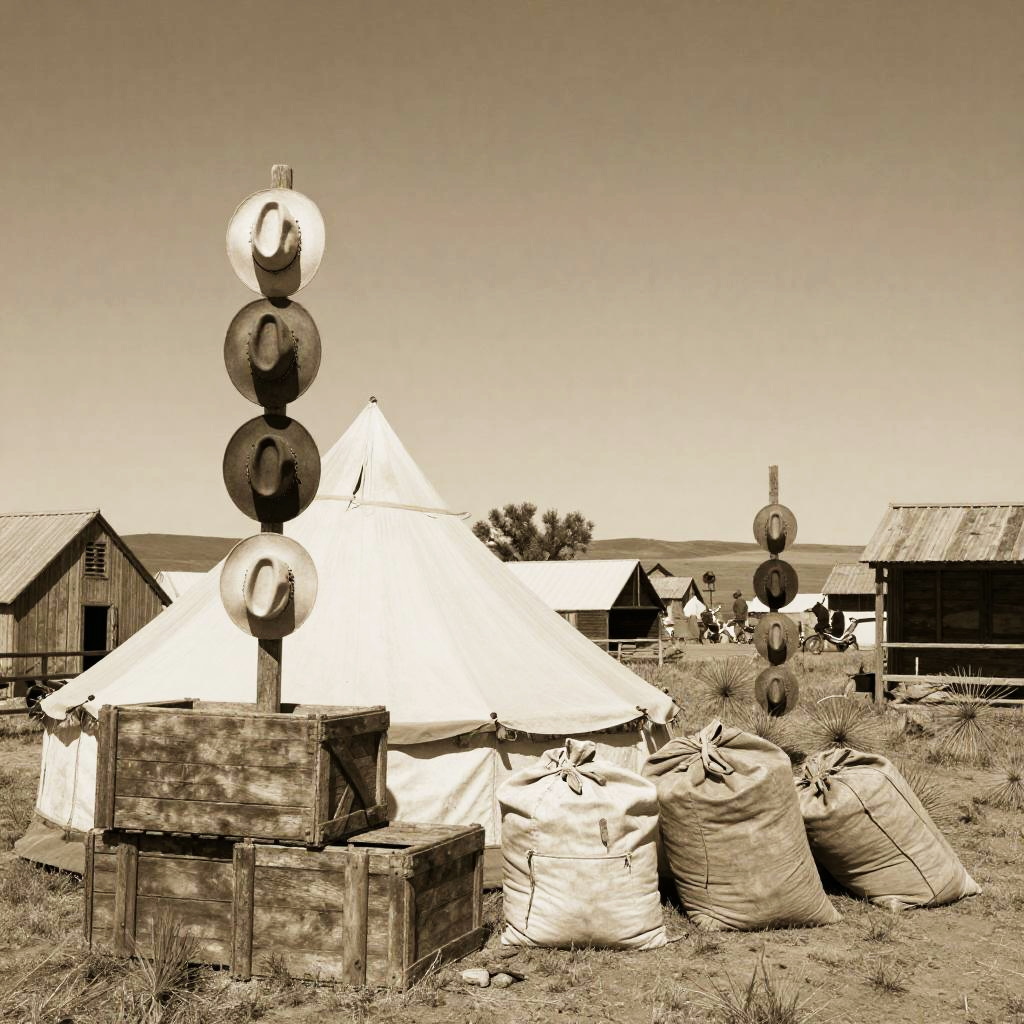 Old west tent inside a bustling frontier camp, wooden crates and canvas sacks scattered, cowboy hats hanging on poles, tumbleweeds blowing by, nostalgic sepia filter, high detail.