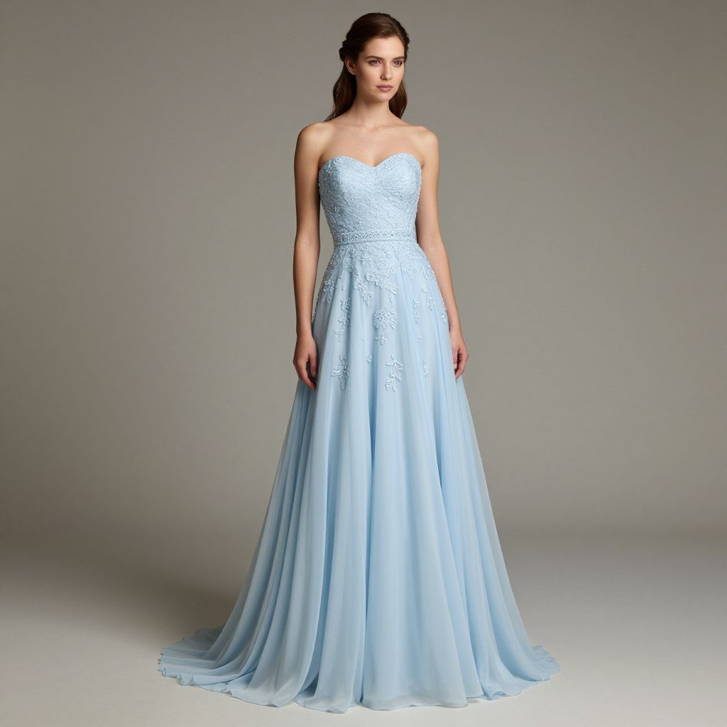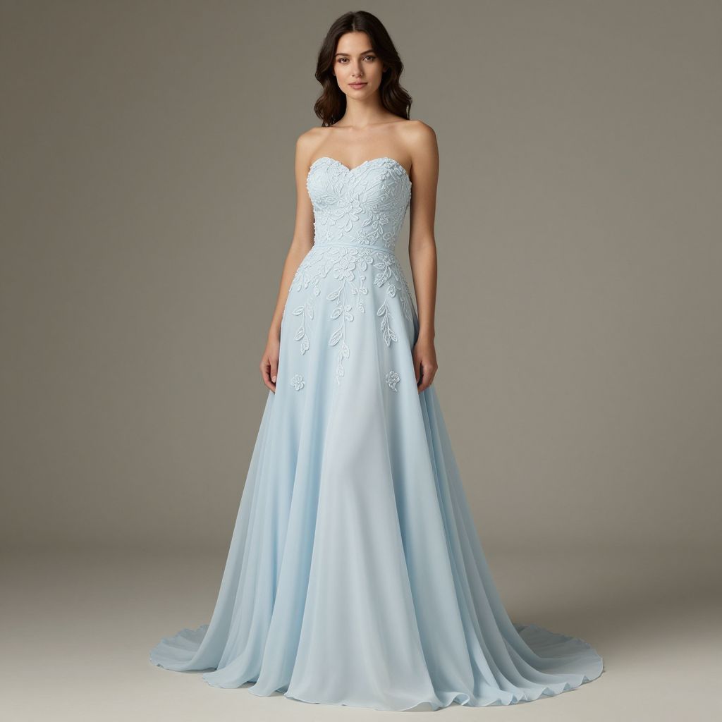 Elegant woman wearing a strapless light blue wedding gown featuring intricate floral embellishments and a flowing chiffon skirt, standing gracefully against a neutral backdrop.
