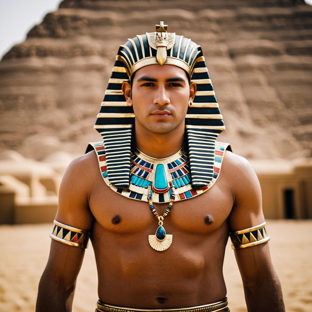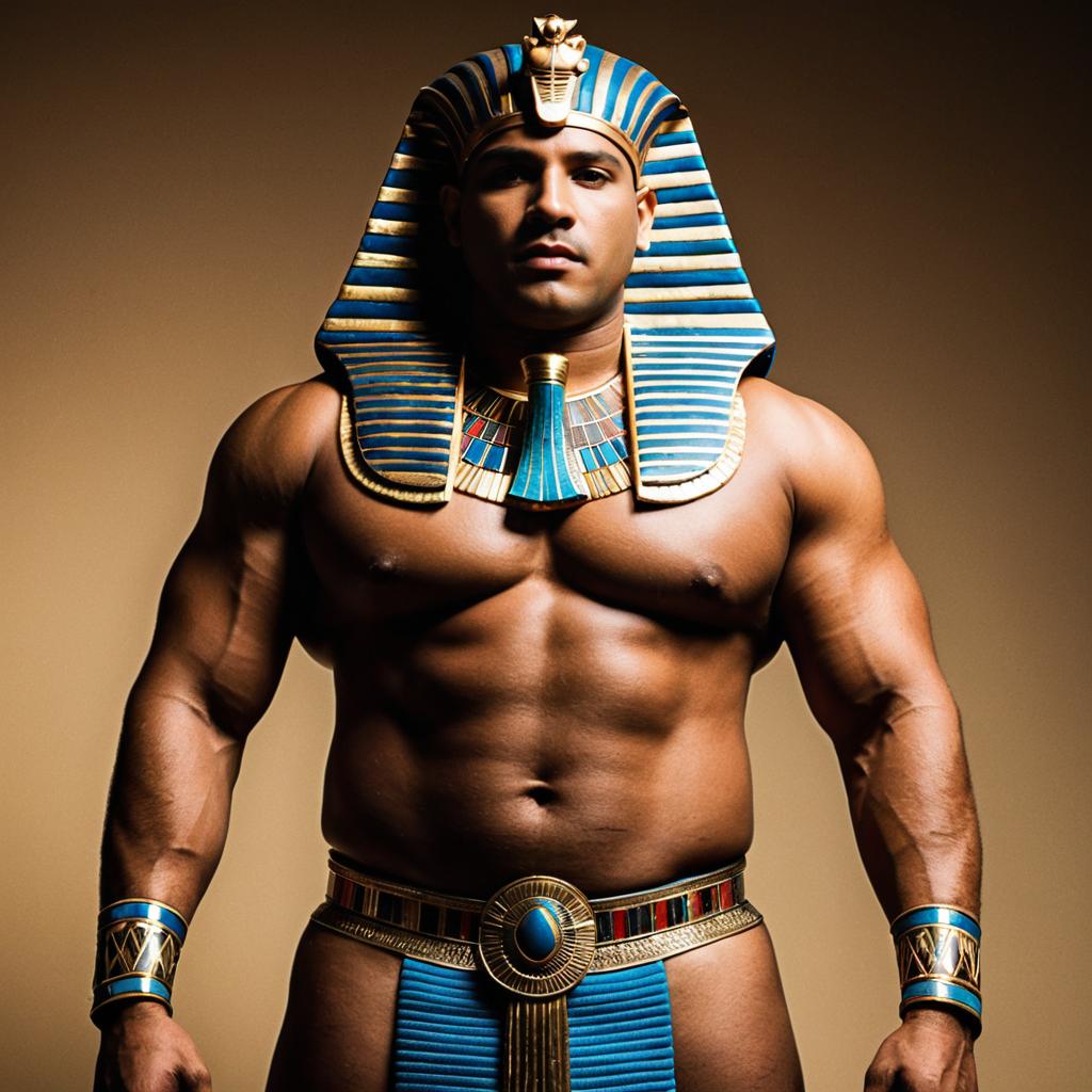 Man plus size king egypt,1boy, male focus, solo, egyptian clothes, egyptian, abs, jewelry, muscular, muscular male, navel, nipples, pectorals, topless male, usekh collar, standing, realistic, closed mouth