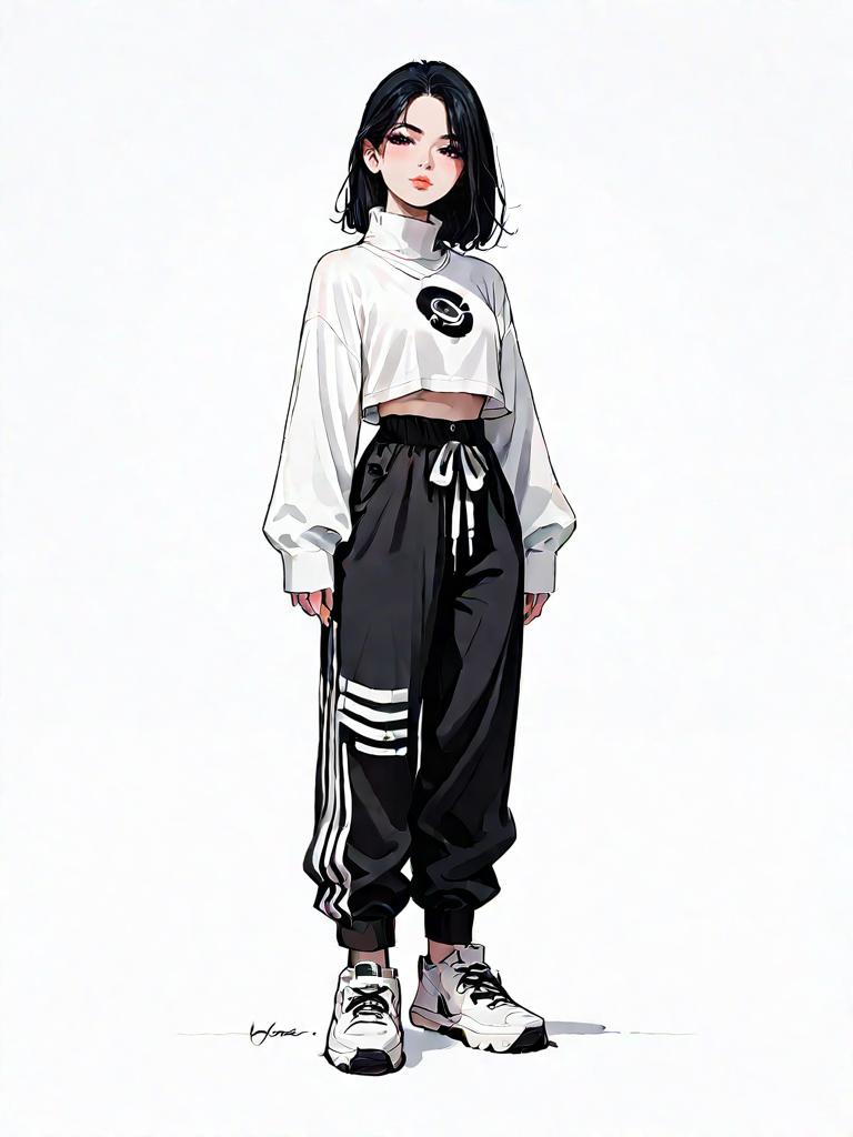 Full body illustration of a young woman with realistic facial features wearing sporty winter clothing. She has black hair and blue eyes, dressed in a black beanie with pom-pom, an oversized white padded jacket with black sleeves and text details, black high-waisted pants, black gloves, and black sneakers. The background is plain white, highlighting her winter fashion style.