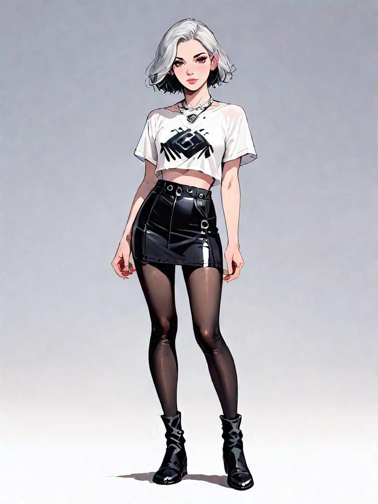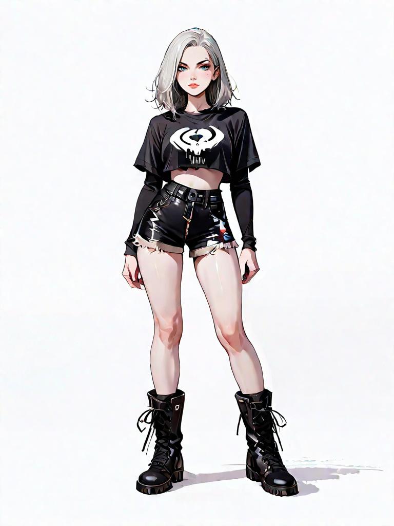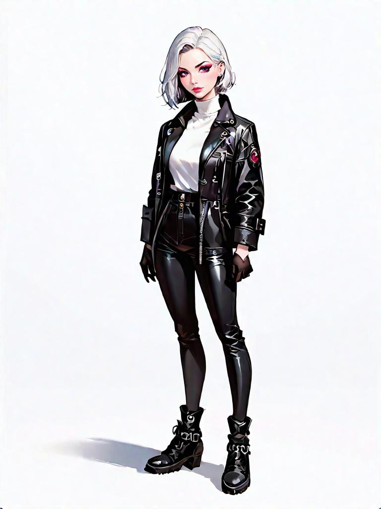 1girl, source_comics, realistic face, full body shot, Woman, sporty winter style, oversized black puffer jacket with high collar and hood, zip-up front, multiple zippered pockets, white skinny pants, black leather gloves, black wool beanie with logo, plain white studio background