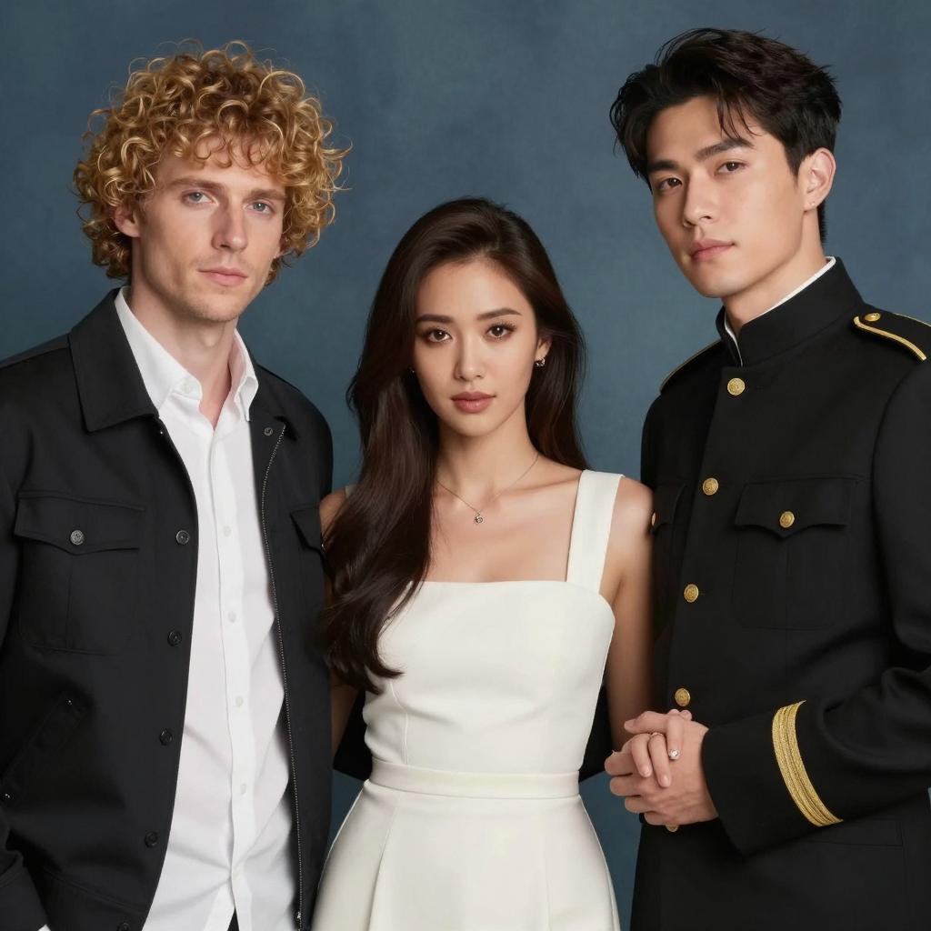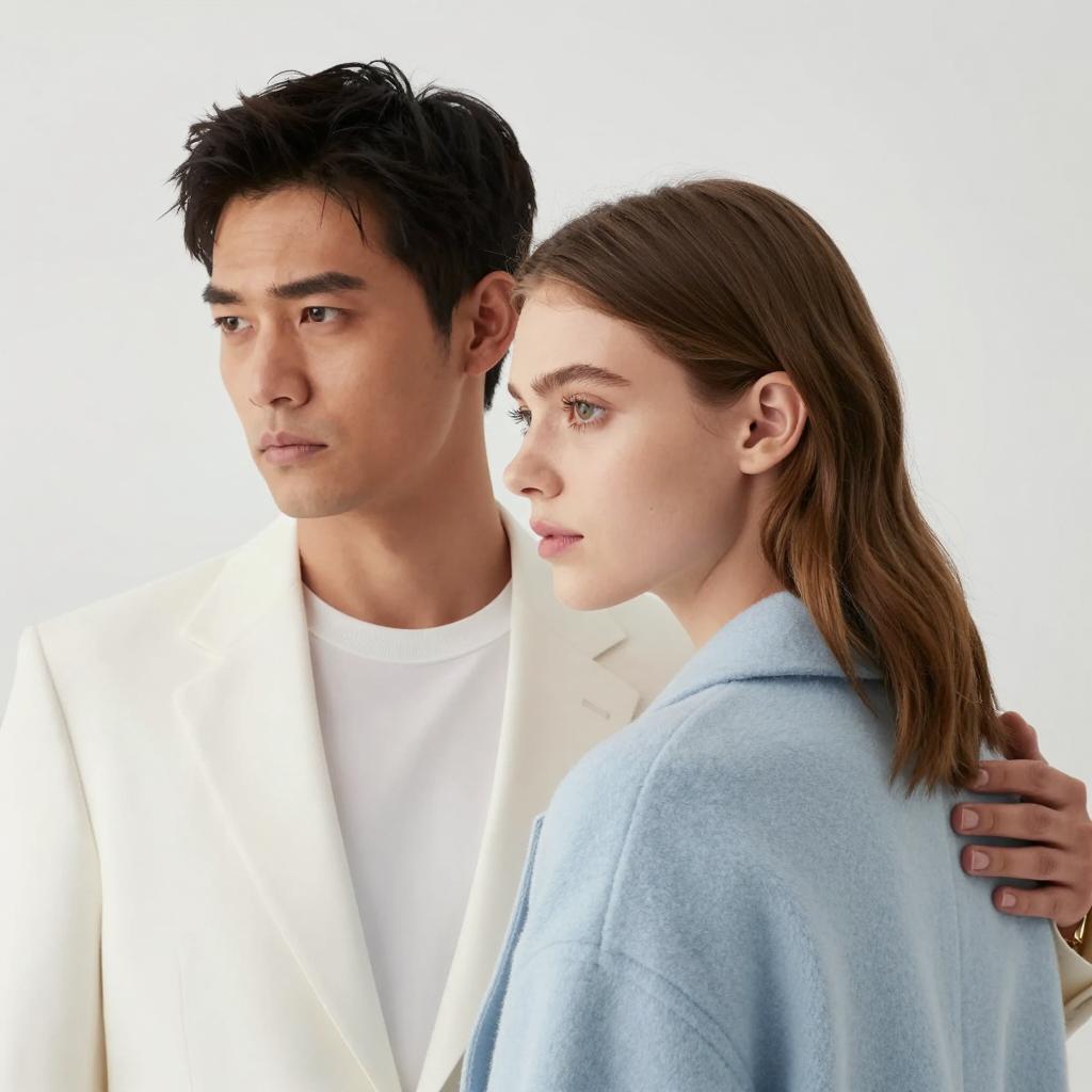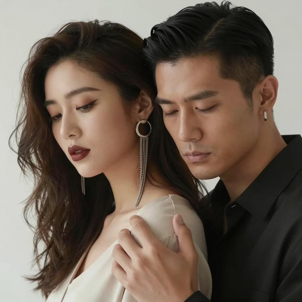 Close-up portrait of a young Asian man and a Caucasian woman standing side by side. The man has dark hair and a serious expression, wearing a colorful patterned jacket over a black shirt. The woman has blonde hair styled in loose waves, wearing a decorative beaded headpiece and gold hoop earrings. Both have neutral facial expressions with a bright, colorful background featuring text elements and yellow star symbols overlaying the image.