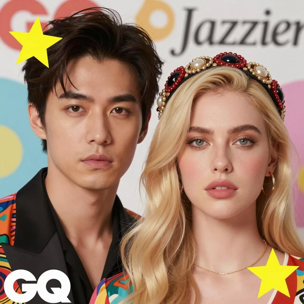 A man and woman in a close-up shot. Man on the left, dark hair, serious expression, wearing a jacket with colorful patterns. Woman on the right, blonde hair, serious expression, wearing a decorative headpiece. Bright, colorful background with bokeh light effects. Two yellow star symbols overlaying the image. Text "GQ" and "Jazzier" visible in the background.