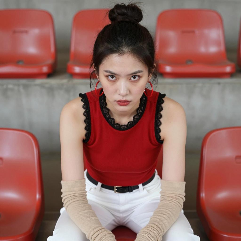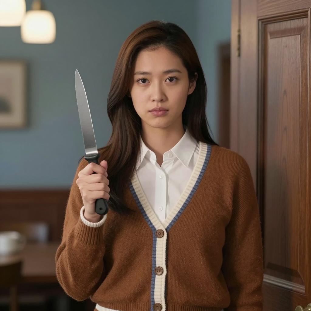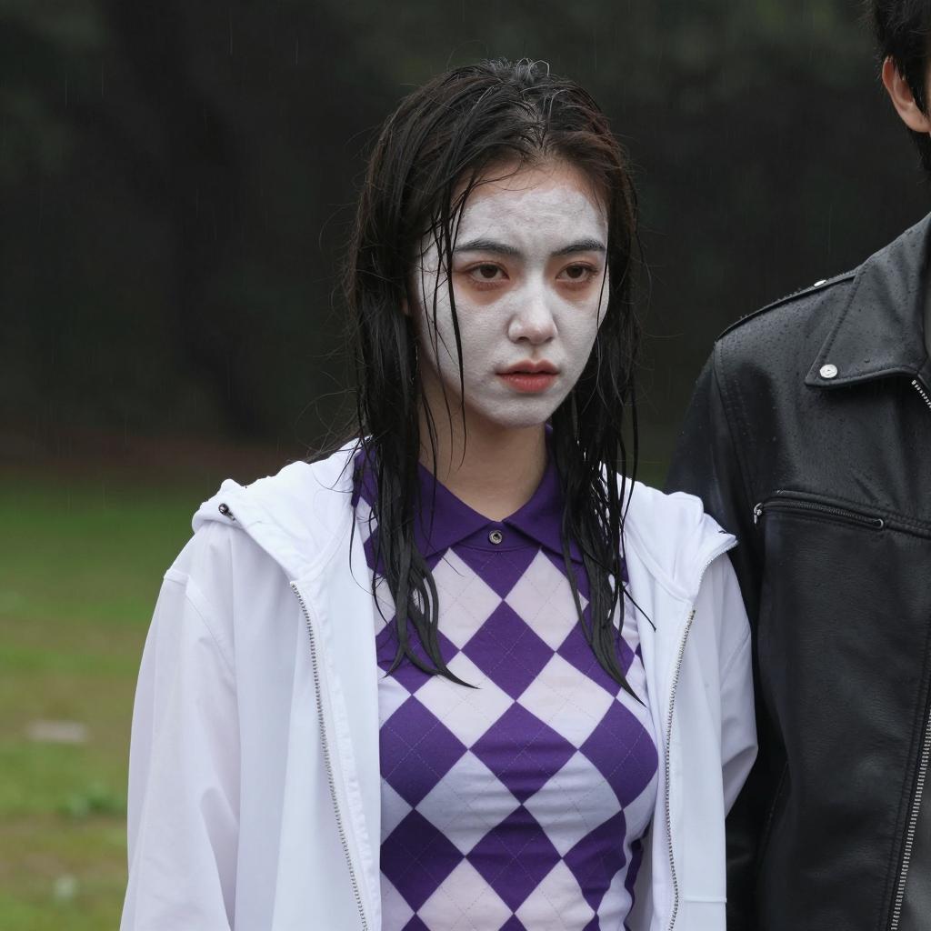Young woman with wet, dark hair, white face paint, wearing a purple and white diamond-patterned shirt and white jacket. Standing outdoors, next to a person in a black leather jacket. Background has dark trees and green grass. Intense facial expression. Wet hair and jacket suggest recent rain. Two people.