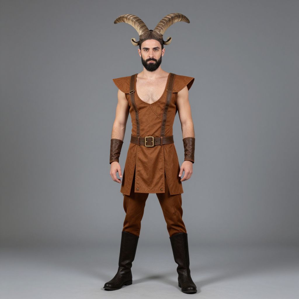 Antiope costume, 1boy, solo, male focus, full body, standing, facial hair, beard, boots, looking at viewer, black hair