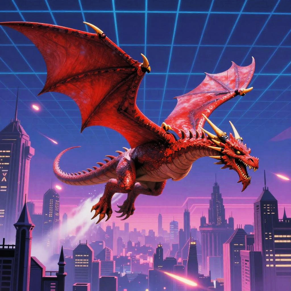 An 80's fantasy art inspired dragon soaring over a futuristic medieval cityscape, neon grid patterns in the background, dynamic composition with glowing effects and sharp contrasts, capturing the essence of retro synthwave aesthetics combined with epic fantasy.