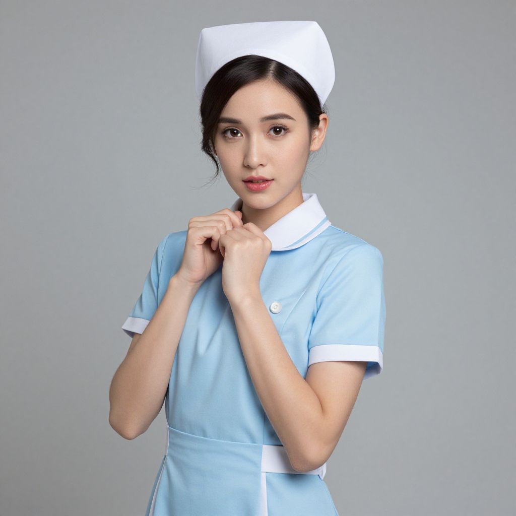 "Woman Frisky Nurse, woman in a blue dress and a white hat"
