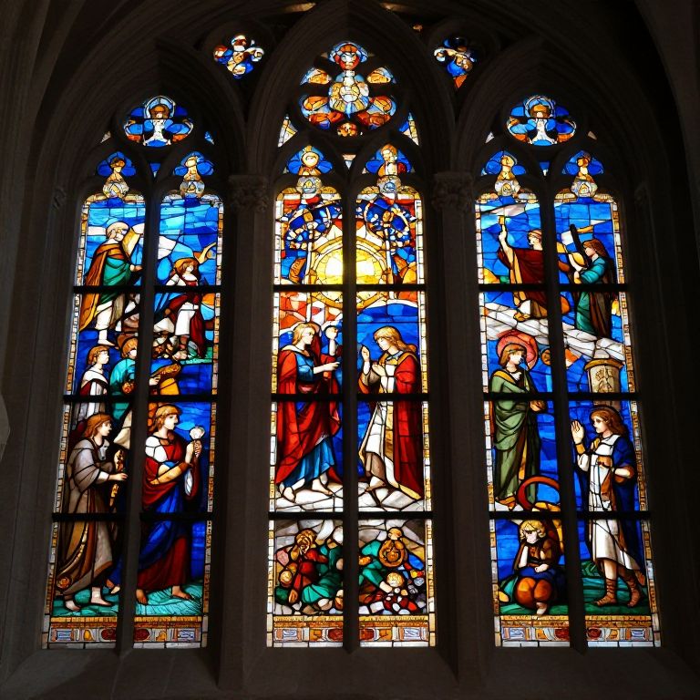 Vibrant stained glass window depicting biblical scenes with colorful figures, intricate details, and arches, illuminated by natural light.