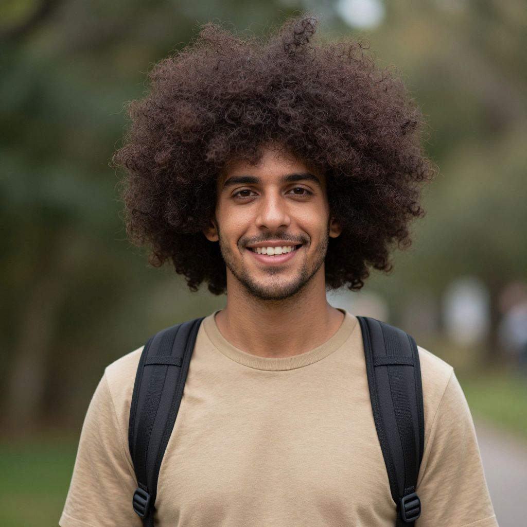Photograph of a smiling young man with a large, curly Afro, wearing a beige shirt and black backpack, standing outdoors against a blurred green and brown
