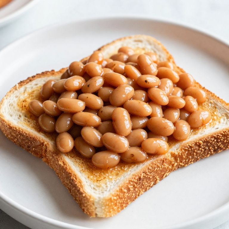 Photograph of a toasted bread slice on a white plate, topped with a generous heap of glossy, brownish-orange baked beans. The bread has a golden-brown crust with a slightly darker, toasted edge, and the beans are shiny with a slightly sticky texture, indicating they are well-cooked. The image is brightly lit, highlighting the textures and colors of the bread and beans. The background is blurred, focusing attention on the toast and beans.