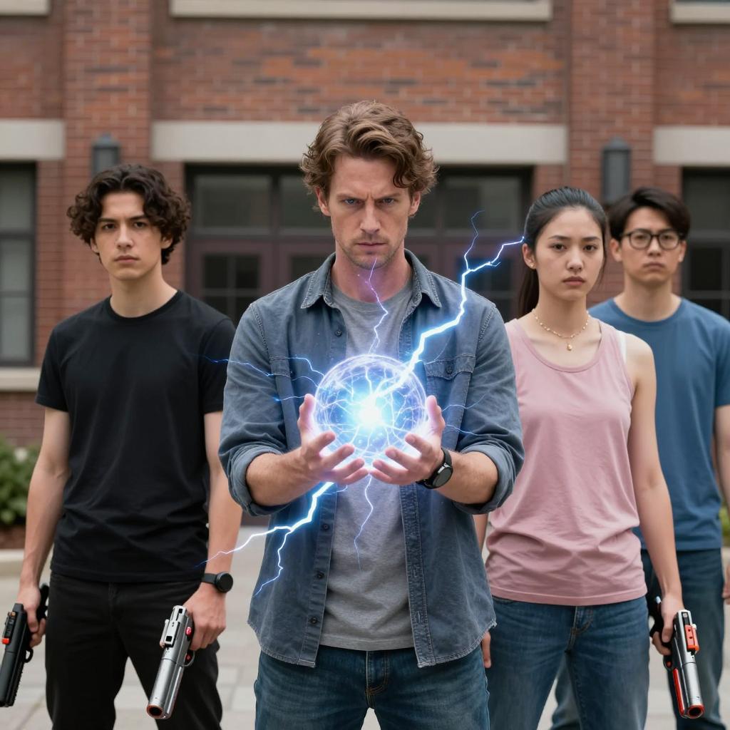 Horror Movie Scene with Menacing Elderly Man and Young Man Suspended