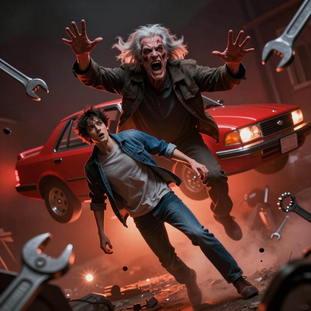 Dynamic horror movie scene featuring a menacing elderly man with long gray hair and a screaming expression, arms raised aggressively. Below him, a young man wearing a blue denim shirt and jeans is suspended mid-air in a dramatic pose. A red car is visible in the background with intense red and orange lighting illuminating the scene. Several metallic wrenches and mechanical parts are floating around, enhancing the supernatural and intense atmosphere.