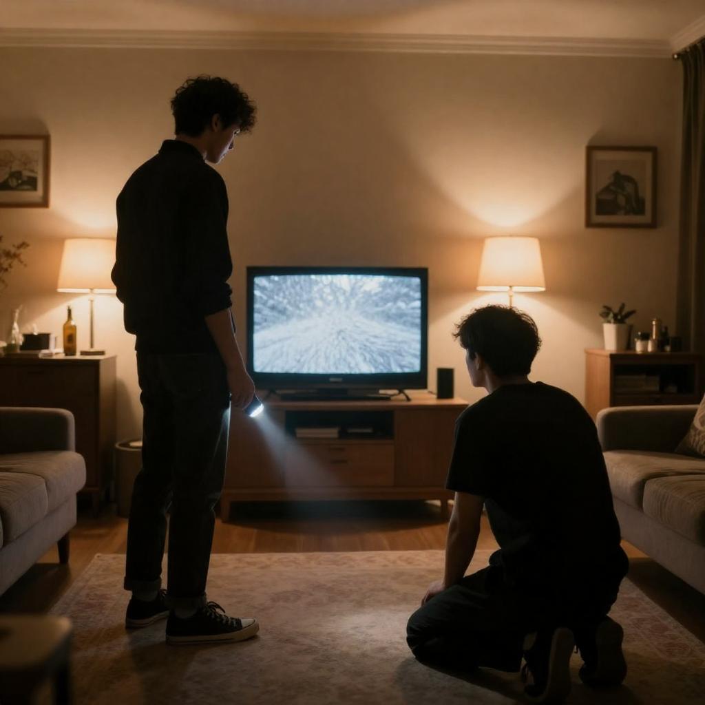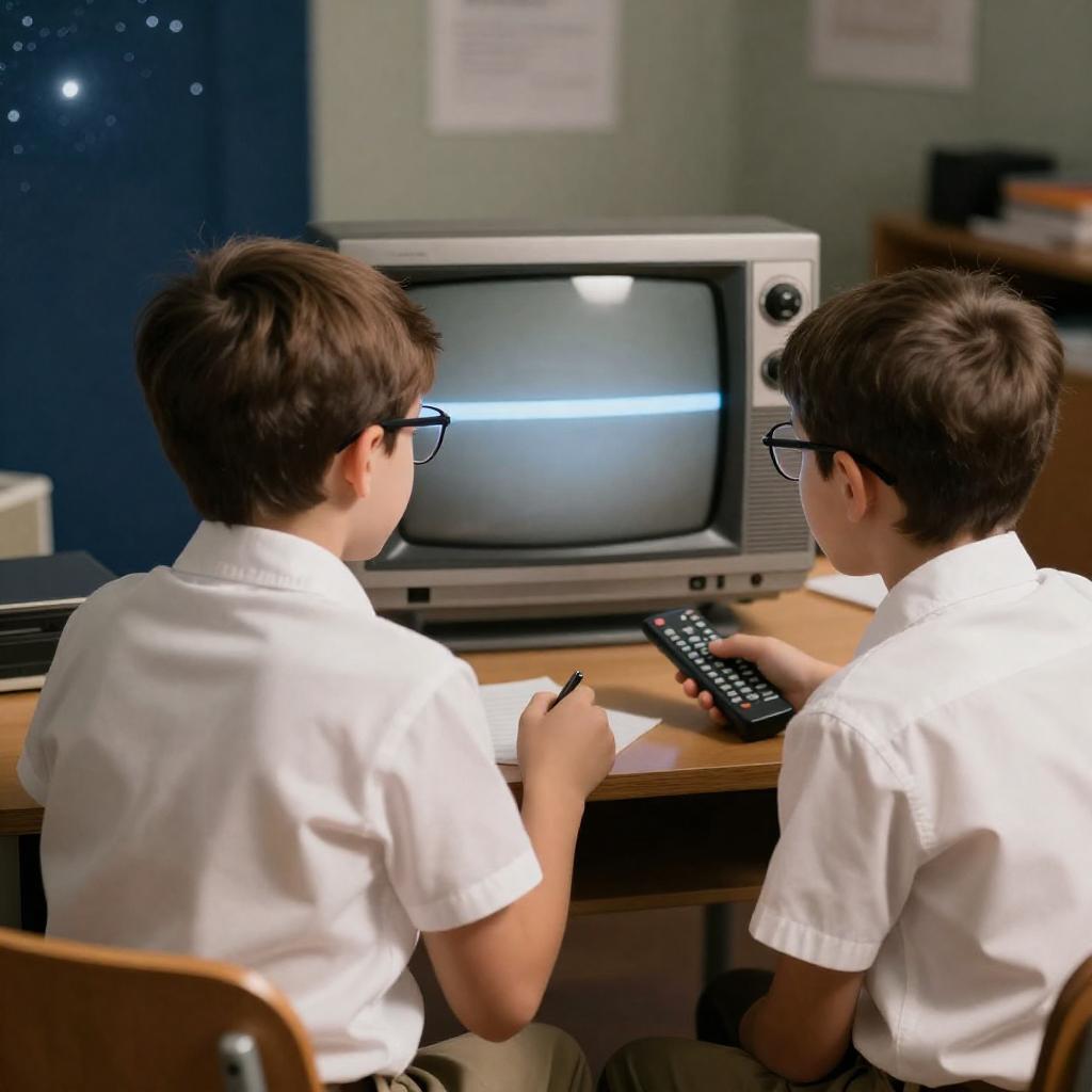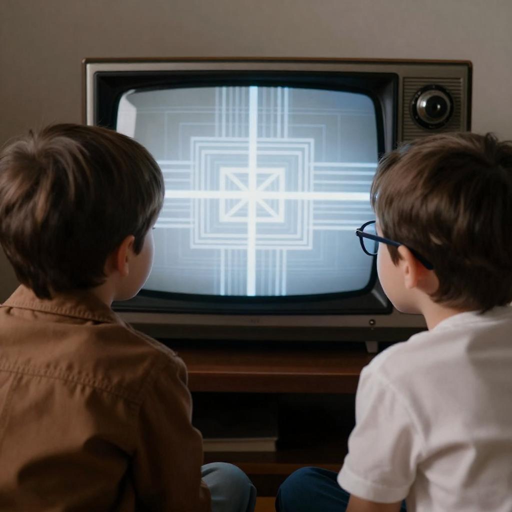 Photograph of two young boys with brown hair, one in a brown jacket and the other in a white shirt with glasses, intently watching a retro television displaying a complex, white, geometric pattern. The background is dimly lit, emphasizing the TV screen and the boys' focused expressions.
