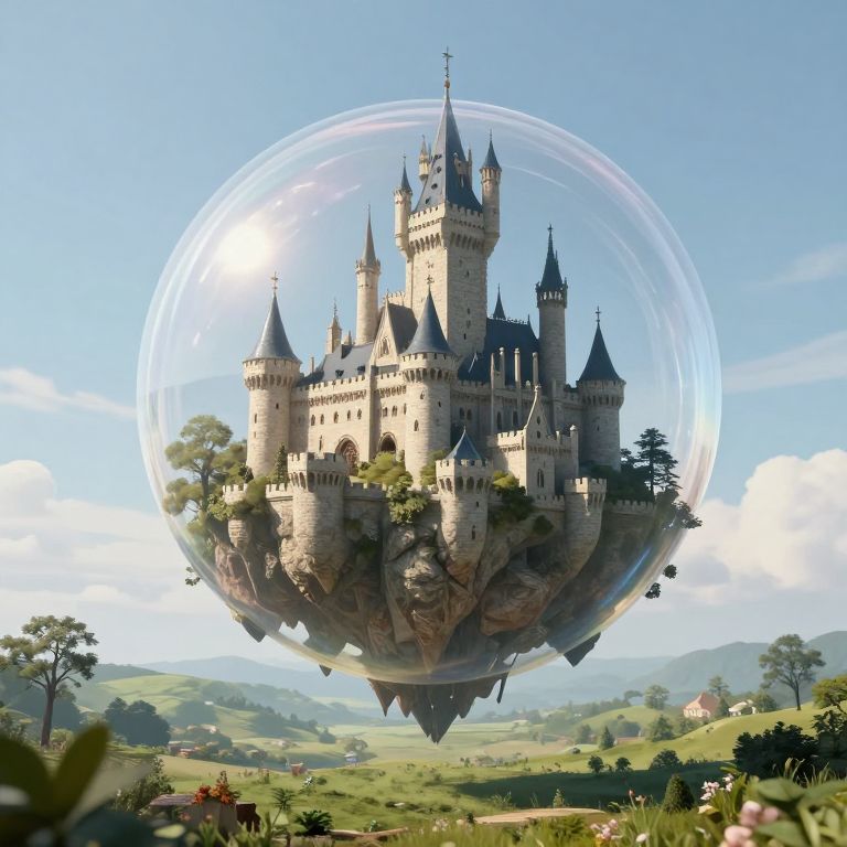 A fantastical 3D-rendered medieval castle, encased in a colossal translucent bubble, floats serenely above a lush landscape, its inverted silhouette mirrored against the serene sky, evoking a dreamlike, otherworldly atmosphere.