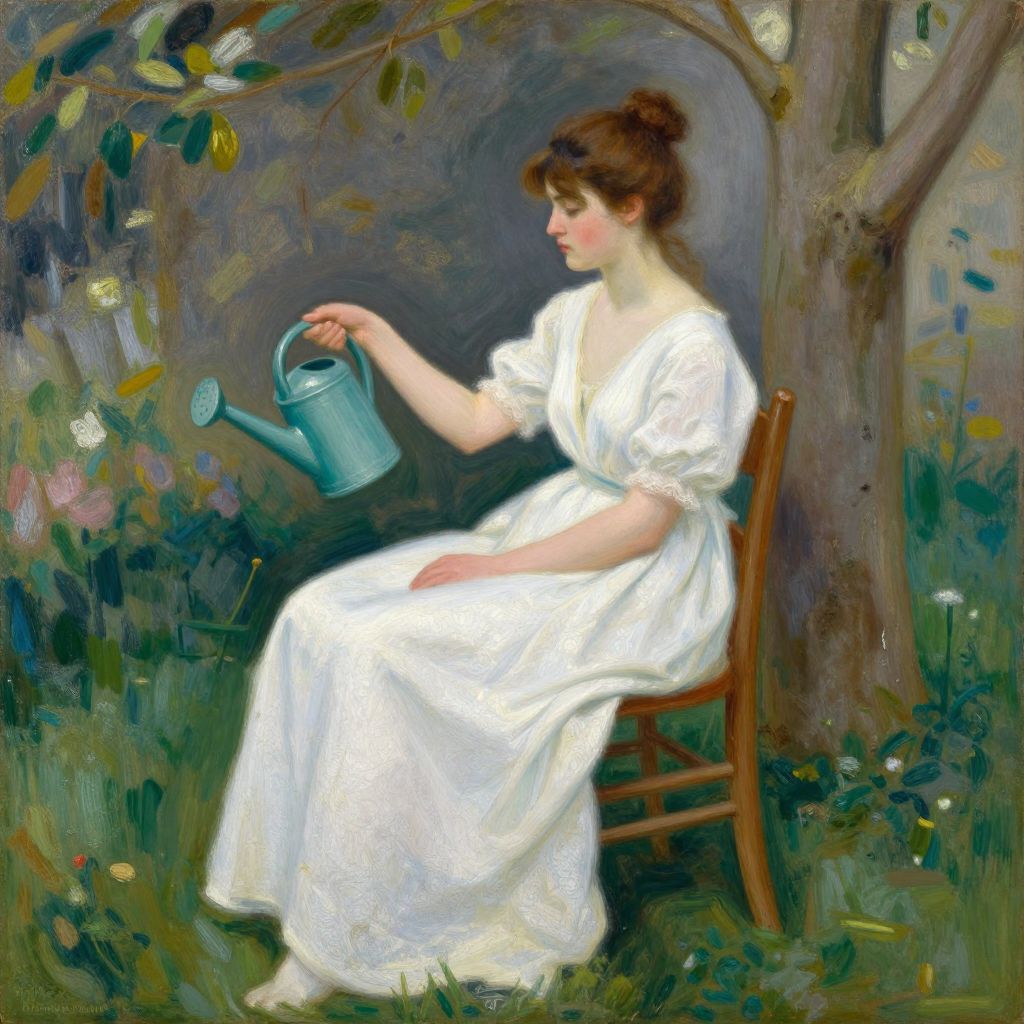 Painting of a fair-skinned woman with brown hair in a white dress, sitting on a wooden chair, holding a blue watering can, surrounded by