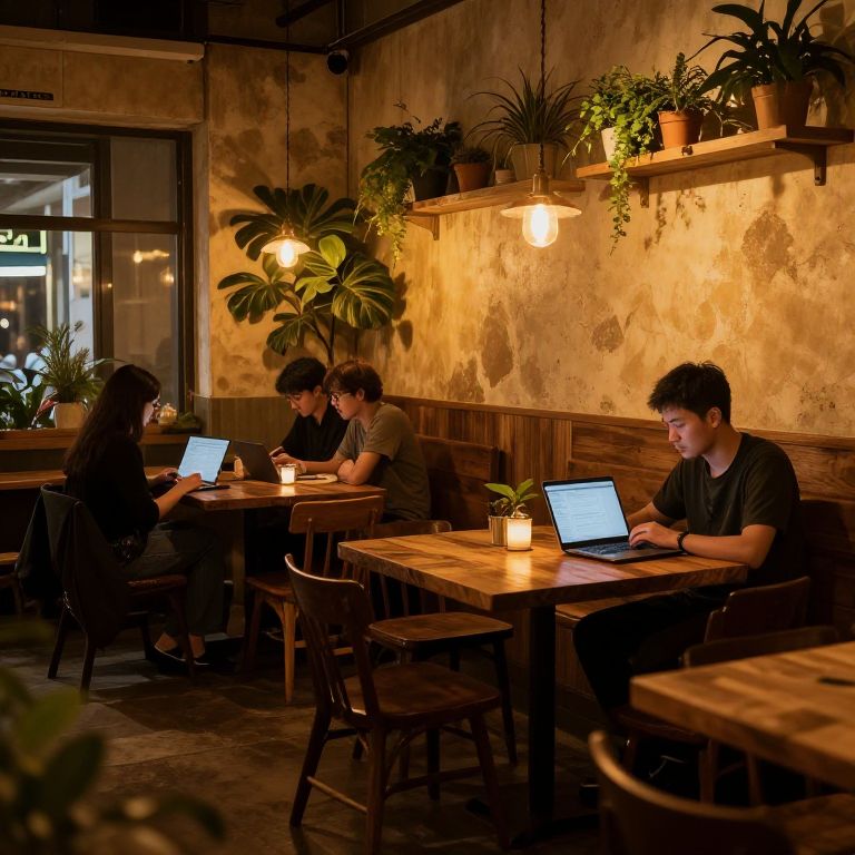 Photograph of a cozy, dimly-lit café with rustic, textured walls. Four young adults, two women and two men, sit at wooden tables, focused on their laptops. They wear casual clothes in dark colors. Warm, yellow pendant lights hang from the ceiling, illuminating the space. Potted plants are arranged on shelves along the wall and on tables. A window on the left side reveals a glimpse of an outside street. The tables have small candles, adding to the warm ambiance. The overall vibe is relaxed and studious.