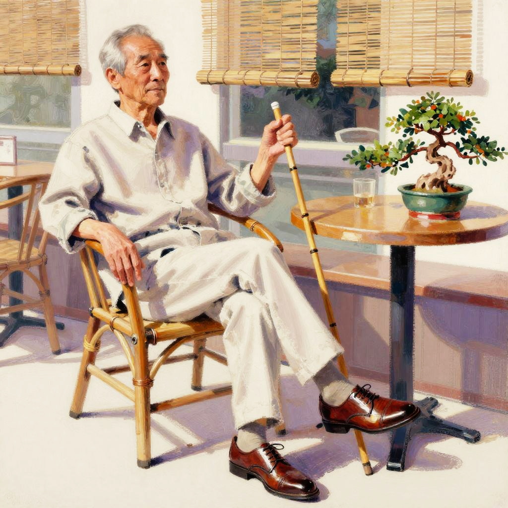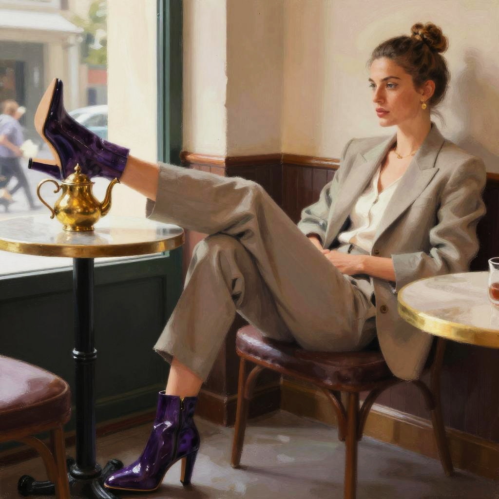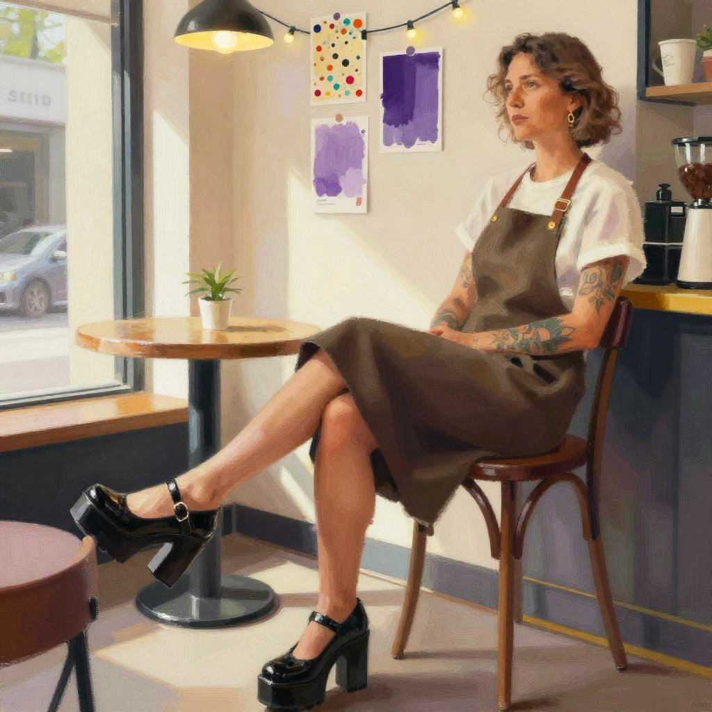 Teenage girl with long green hair lounging in a sunlit café, highlighting her flip flops in a loose painterly style, notan ::5 contrast, local color ::3, warmth, golden ratio harmony, refined bone structure, expressive loose strokes ::3, accented by delicate paper cranes ::3, amber glazes ::2, small colorful pointillism ::5, in style of Hasttim Aklb ::5