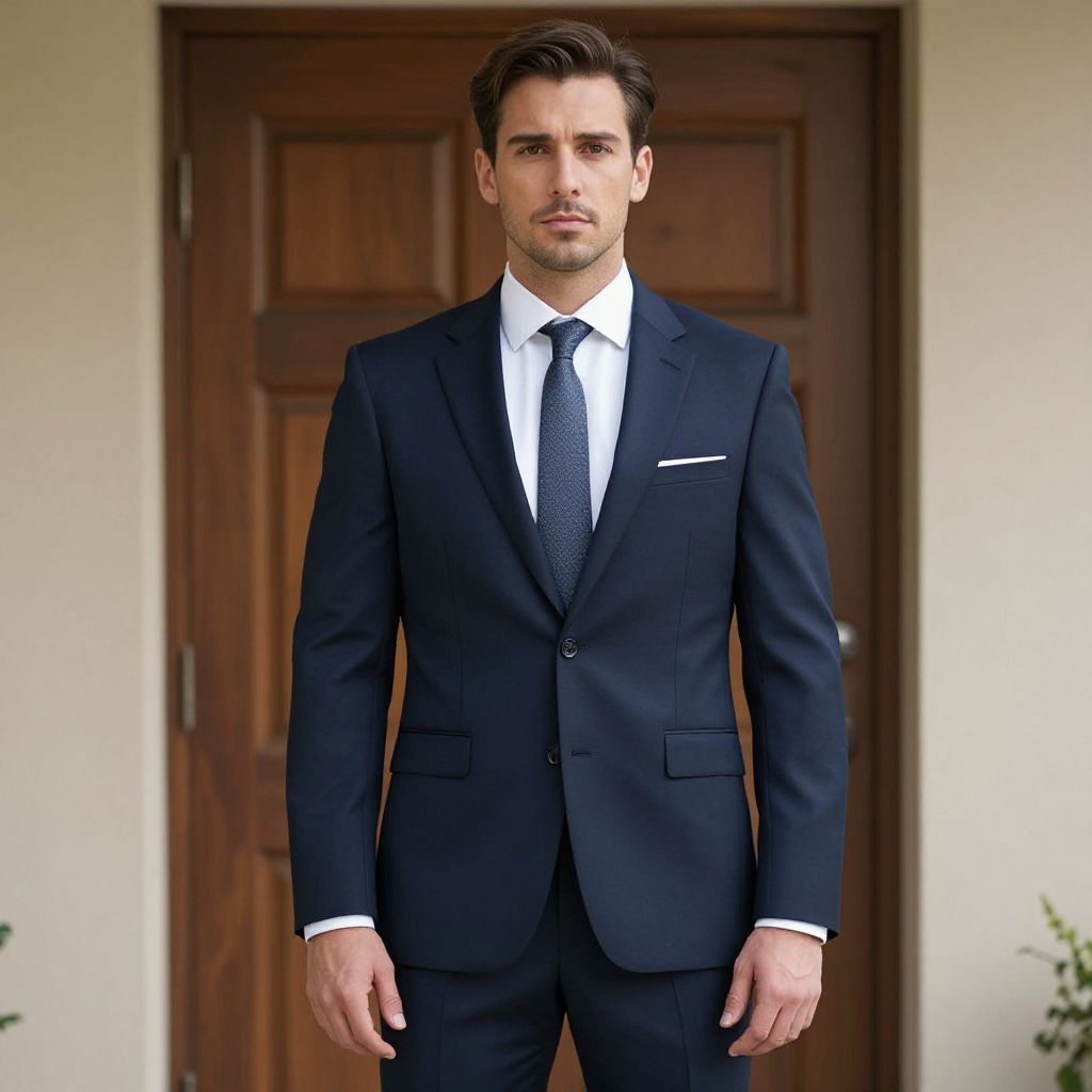 Photograph of a handsome Caucasian man with short, dark brown hair and light stubble, standing in front of a wooden door. He wears a tailored, dark navy blue suit with a white dress shirt and a black patterned tie. A white pocket square is neatly tucked into his left breast pocket. His expression is serious and focused. The background features a plain, cream-colored wall with the wooden door centered behind him. The image is well-lit with natural light, highlighting the textures of his suit and the wood.