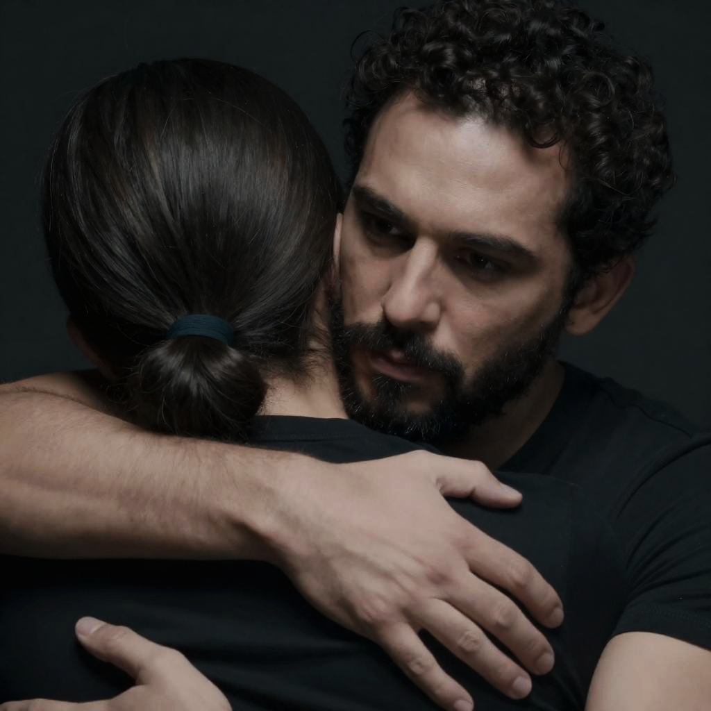 Close-up photograph of a man with short, curly dark hair and a beard, hugging a person with dark, slicked-back hair. The man's right hand grips the other person's left arm. Low lighting, dark background. Man's intense gaze.