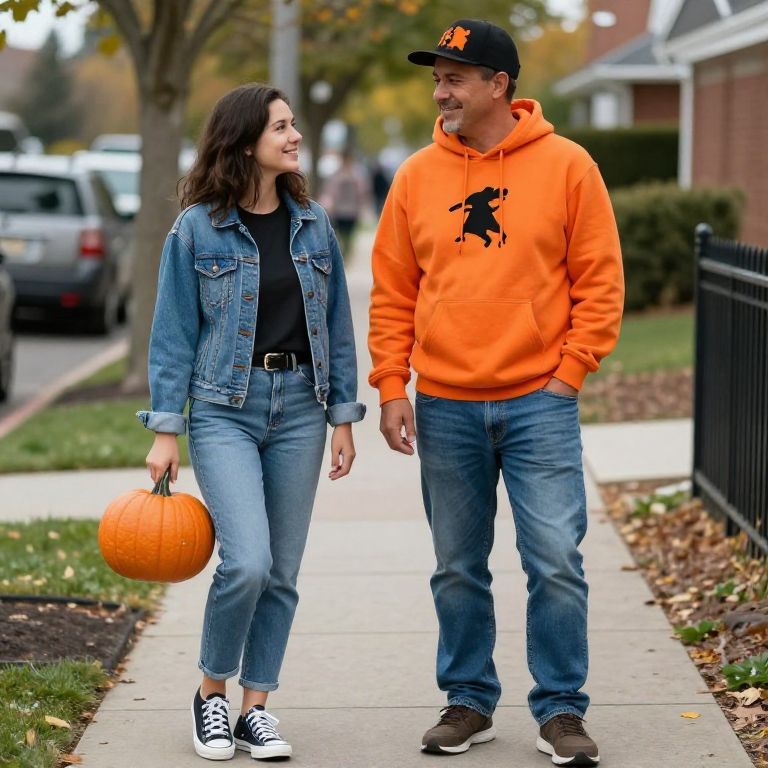 Photograph of a young couple walking on a suburban sidewalk during autumn. The woman, with long dark hair, wears a blue denim jacket over a black top, light blue jeans, and black-and-white sneakers, holding a small orange pumpkin. The man, with a beard and dark hair, wears a black cap with an orange emblem, an orange hoodie with a black silhouette design, blue jeans, and brown shoes. They both smile at each other. The background shows trees with yellowing leaves, a parked car, and a black fence. The sidewalk is lined with mulched flower beds.