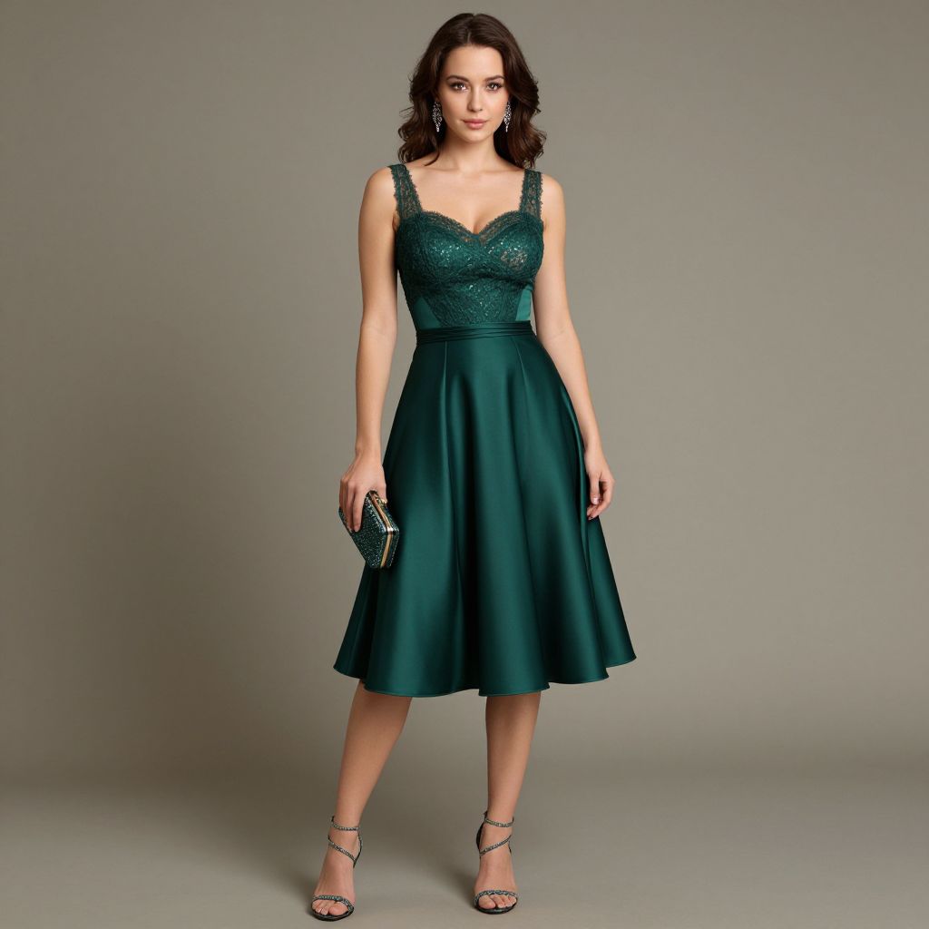 Full body shot, woman, elegant fit and flare dress, deep emerald green satin, sweetheart neckline, delicate lace overlay, cinched waist, flared skirt, knee-length hem, paired with strappy silver heels, shimmering sequins, matching clutch purse, silver statement earrings, soft waves hairstyle, subtle makeup, confident pose, sophisticated ambiance Sexy. Pretty face and beаutiful eyes. Big breasts