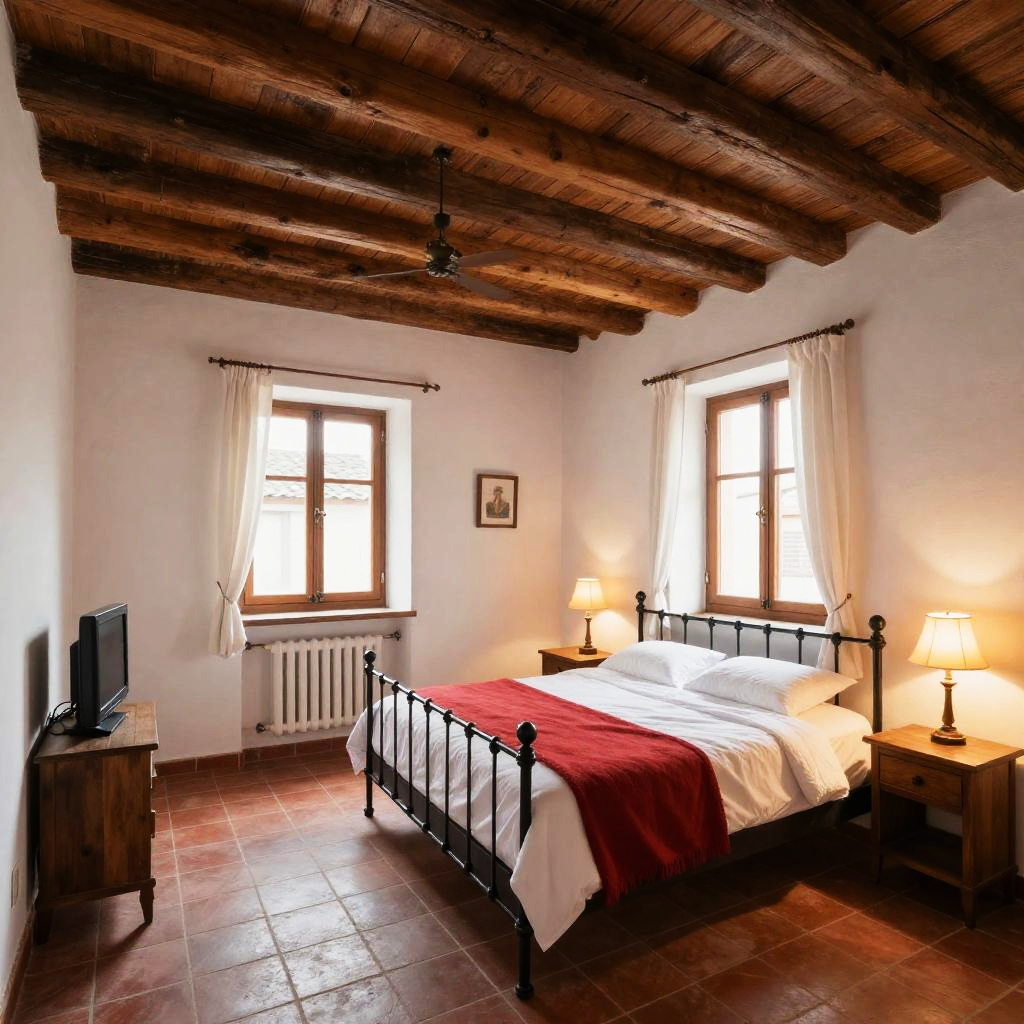 This cozy room features a rustic wooden ceiling with exposed beams, white walls, and terracotta floor tiles. A black iron-framed bed with white sheets and a red blanket sits against the right wall, flanked by wooden nightstands with warm table lamps. Two windows with wooden frames and white curtains let in natural light. A small TV sits on a radiator near the left window.
