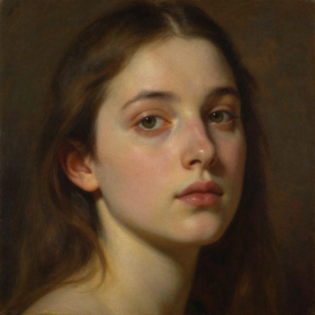 Photorealistic oil painting of a young Caucasian woman with fair skin, brown eyes, and long brown hair, looking slightly to the right. Dark background