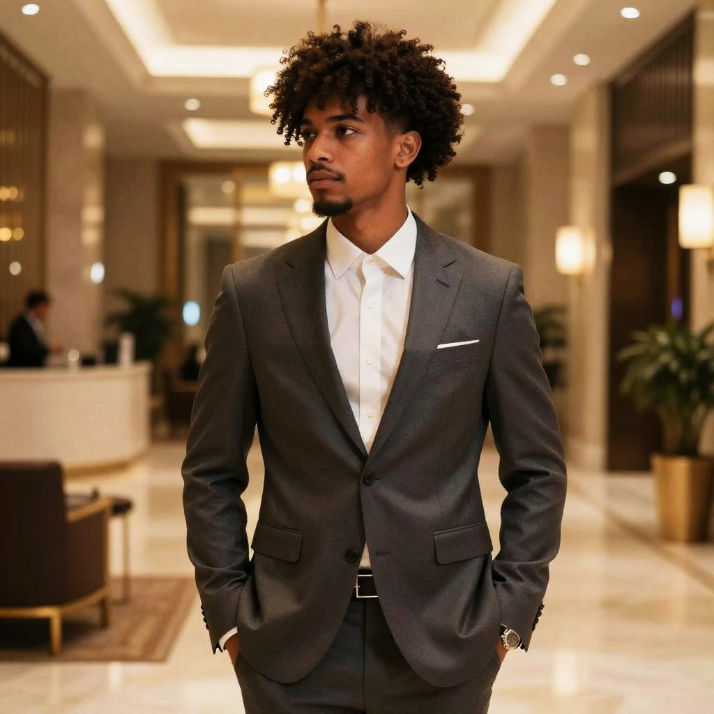 Drop Fade Afro hairstyle on man, wearing modern tailored suit, in luxury hotel lobby, captured in fashion editorial style with soft ambient lighting.