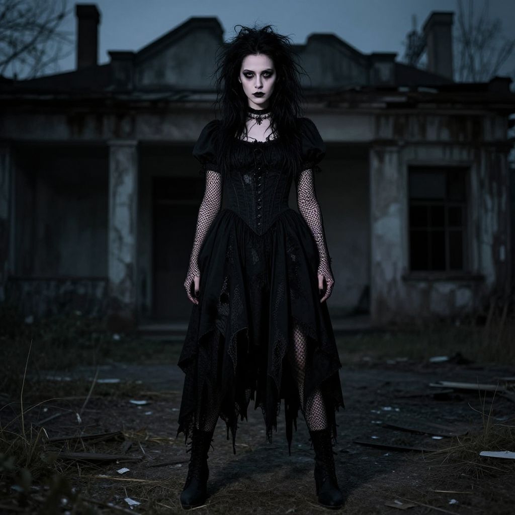 Gothic woman with pale skin, black fringed dress, fishnet gloves, and wild hair stands in front of a dark, abandoned building at